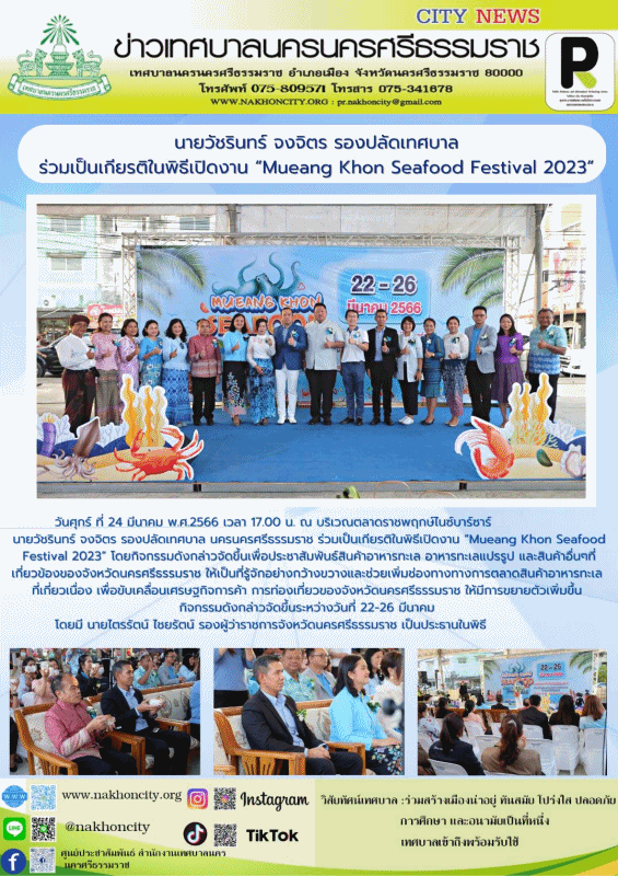 วันศุกร์ ที่ 24 มีนาคม พ.ศ.2566 เวลา 17.00 น. ณ บริเวณตลาดราชพฤกษ์ไนซ์บาร์ซาร์ นายวัชรินทร์ จงจิตร รองปลัดเทศบาล นครนครศรีธรรมราช ร่วมเป็นเกียรติในพิธีเปิดงาน “Mueang Khon Seafood Festival 2023” โดยกิจกรรมดังกล่าวจัดขึ้นเพื่อประชาสัมพันธ์สินค้าอาหารทะเล อาหารทะเลแปรรูป และสินค้าอื่นๆที่เกี่ยวข้องของจังหวัดนครศรีธรรมราช ให้เป็นที่รู้จักอย่างกว้างขวางและช่วยเพิ่มช่องทางทางการตลาดสินค้าอาหารทะเล ที่เกี่ยวเนื่อง เพื่อขับเคลื่อนเศรษฐกิจการค้า การท่องเที่ยวของจังหวัดนครศรีธรรมราช ให้มีการขยายตัวเพิ่มขึ้น กิจกรรมดังกล่าวจัดขึ้นระหว่างวันที่ 22-26 มีนาคม 2566 โดยมี นายไตรรัตน์ ไชยรัตน์ รองผู้ว่าราชการจังหวัดนครศรีธรรมราช เป็นประธานในพิธี ........... ภาพ//ข่าว//จันทร์จิรา |