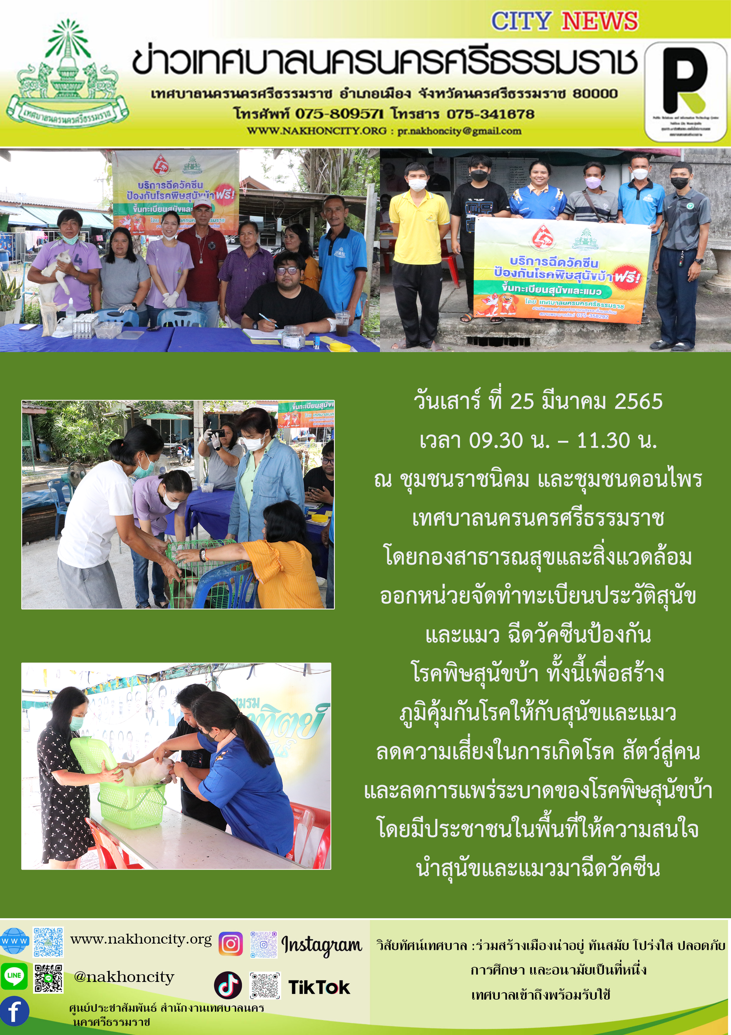 เทศบาลนครนครศรีธรรมราช โดยกองสาธารณสุขและสิ่งแวดล้อม ออกหน่วยจัดทำทะเบียนประวัติสุนัขและแมว ฉีดวัคซีนป้องกันโรคพิษสุนัขบ้า |