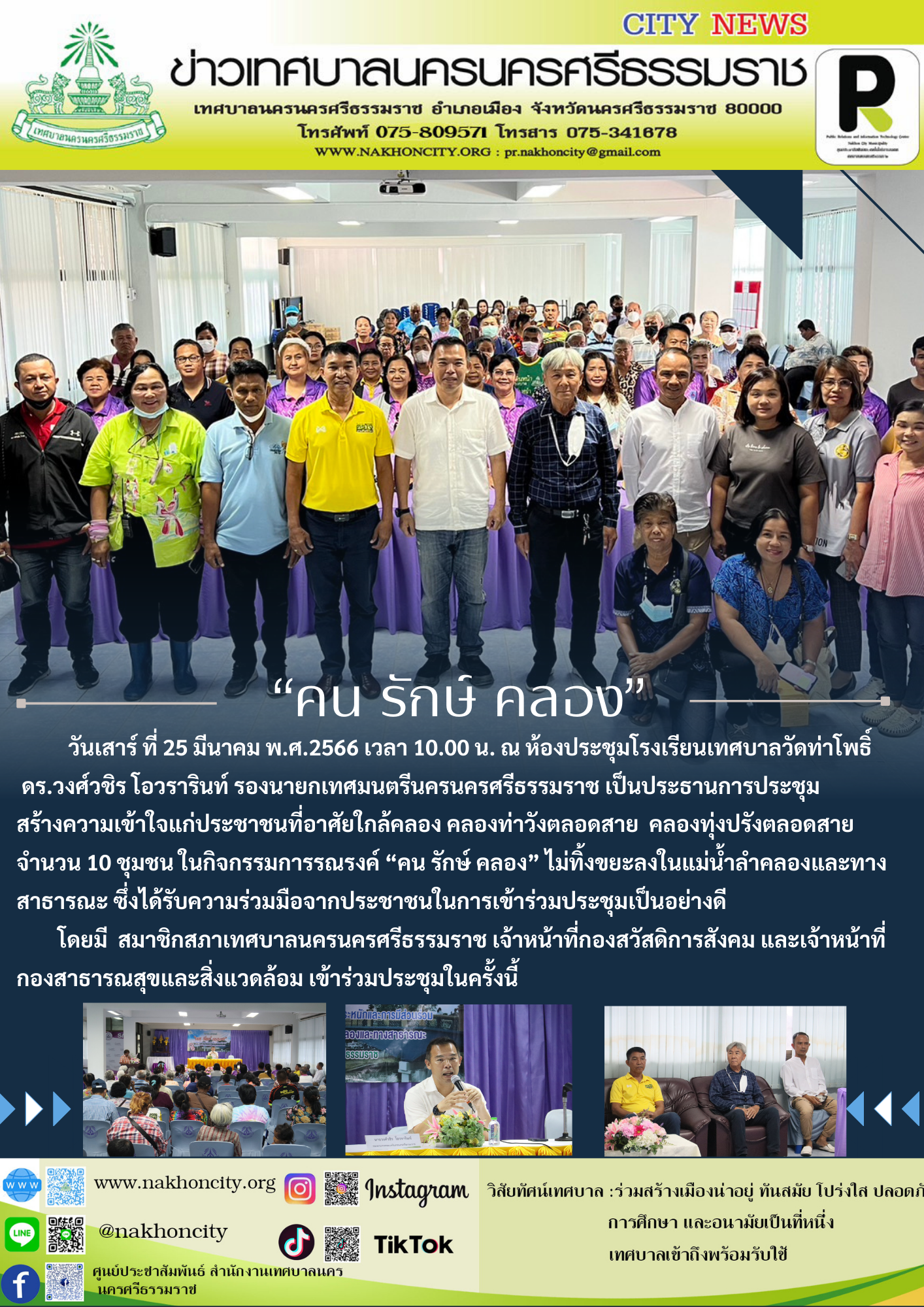 ดร.วงศ์วชิร โอวรารินท์ รองนายกเทศมนตรีนครนครศรีธรรมราช เป็นประธานการประชุมสร้างความเข้าใจแก่ประชาชนที่อาศัยใกล้คลอง คลองท่าวังตลอดสาย คลองทุ่งปรังตลอดสาย จำนวน 10 ชุมชน ในกิจกรรมการรณรงค์ “คน รักษ์ คลอง” ไม่ทิ้งขยะลงในแม่น้ำลำคลองและทางสาธารณะ |
