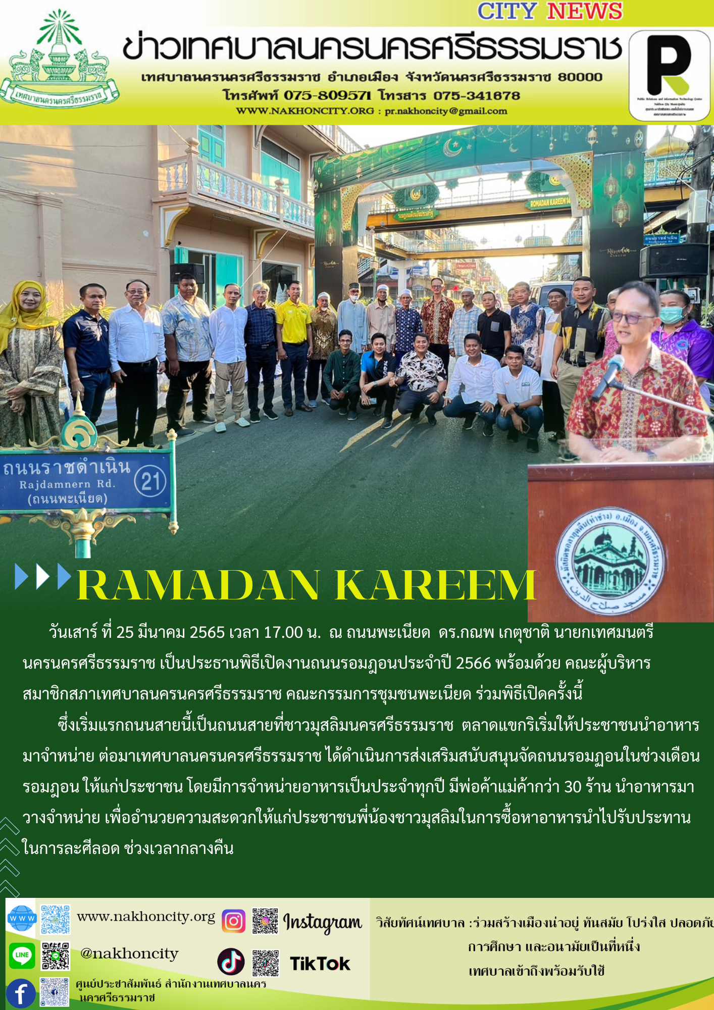 ดร.กณพ เกตุชาติ นายกเทศมนตรีนครนครศรีธรรมราช เป็นประธานพิธีเปิดงานถนนรอมฎอนประจำปี 2566 |