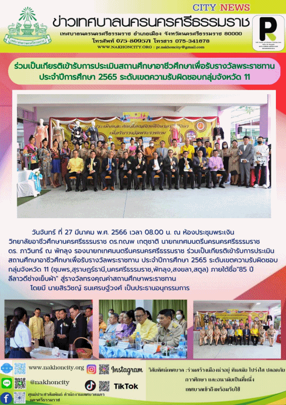 วันจันทร์ ที่ 27 มีนาคม พ.ศ. 2566 เวลา 08.00 น. ณ ห้องประชุมพระเงิน วิทยาลัยอาชีวศึกษานครศรีธรรมราช ดร.กณพ เกตุชาติ นายกเทศมนตรีนครนครศรีธรรมราช พร้อมด้วย ดร. ภาวินทร์ ณ พัทลุง รองนายกเทศมนตรีนครนครศรีธรรมราช ร่วมเป็นเกียรติเข้ารับการประเมินสถานศึกษาอาชีวศึกษาเพื่อรับรางวัลพระราชทาน ประจำปีการศึกษา 2565 ระดับเขตความรับผิดชอบกลุ่มจังหวัด 11 (ชุมพร,สุราษฎร์ธานี,นครศรีธรรมราช,พัทลุง,สงขลา,สตูล) ภายใต้ชื่อ “ 85 ปี ลีลาวดีช่างเย็บผ้า สู่รางวัลทรงคุณค่าสถานศึกษาพระราชทาน ” โดยมี นายสิรวิชญ์ ธนเศรษฐ์วงศ์ เป็นประธานอนุกรรมการ .................. ภาพ//ข่าว//จันทร์จิรา ตรวจทาน//ฐิตินันท์ |