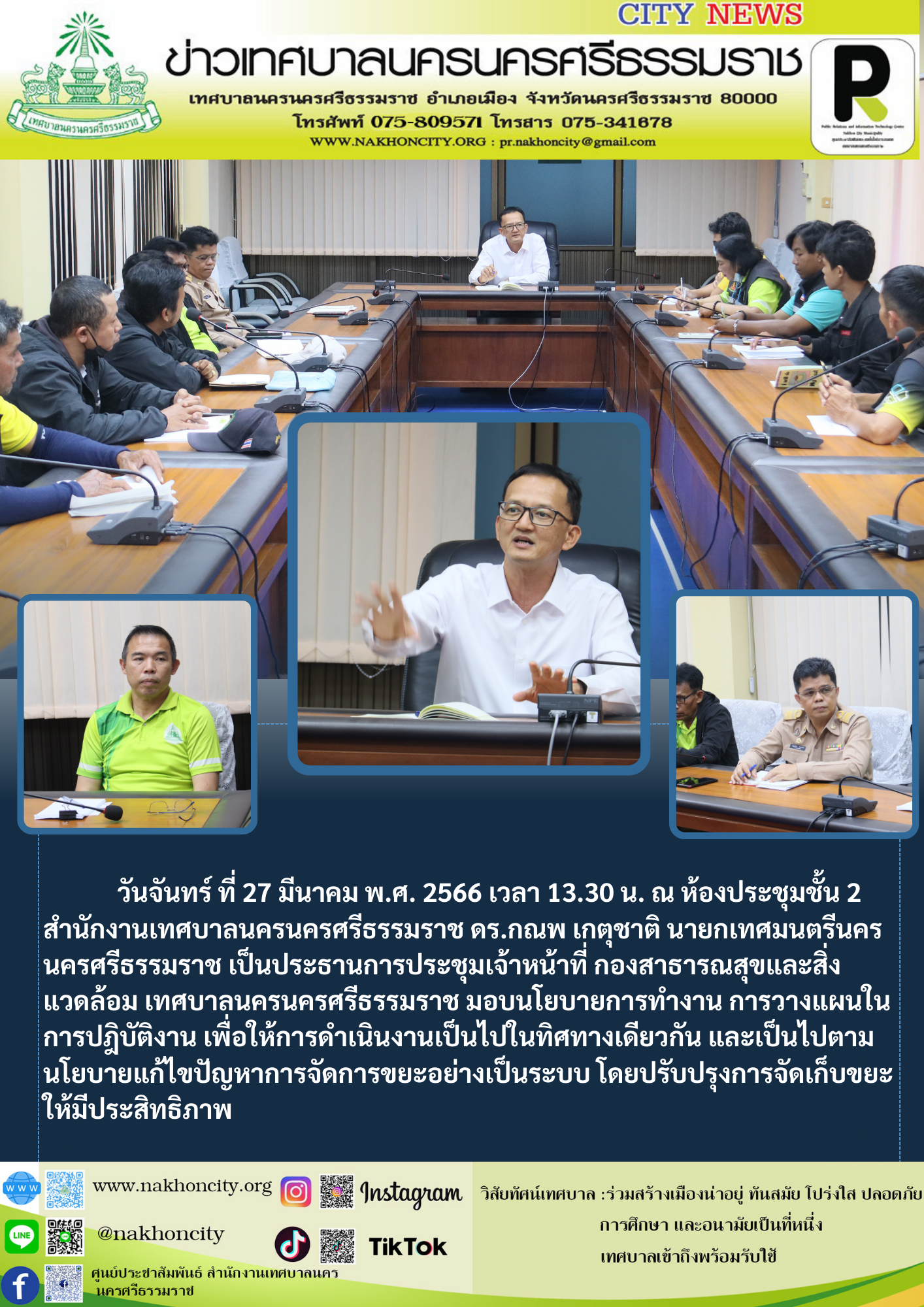 ดร.กณพ เกตุชาติ นายกเทศมนตรีนครนครศรีธรรมราช เป็นประธานการประชุมเจ้าหน้าที่ กองสาธารณสุขและสิ่งแวดล้อม เทศบาลนครนครศรีธรรมราช เพื่อมอบนโยบายการทำงาน |