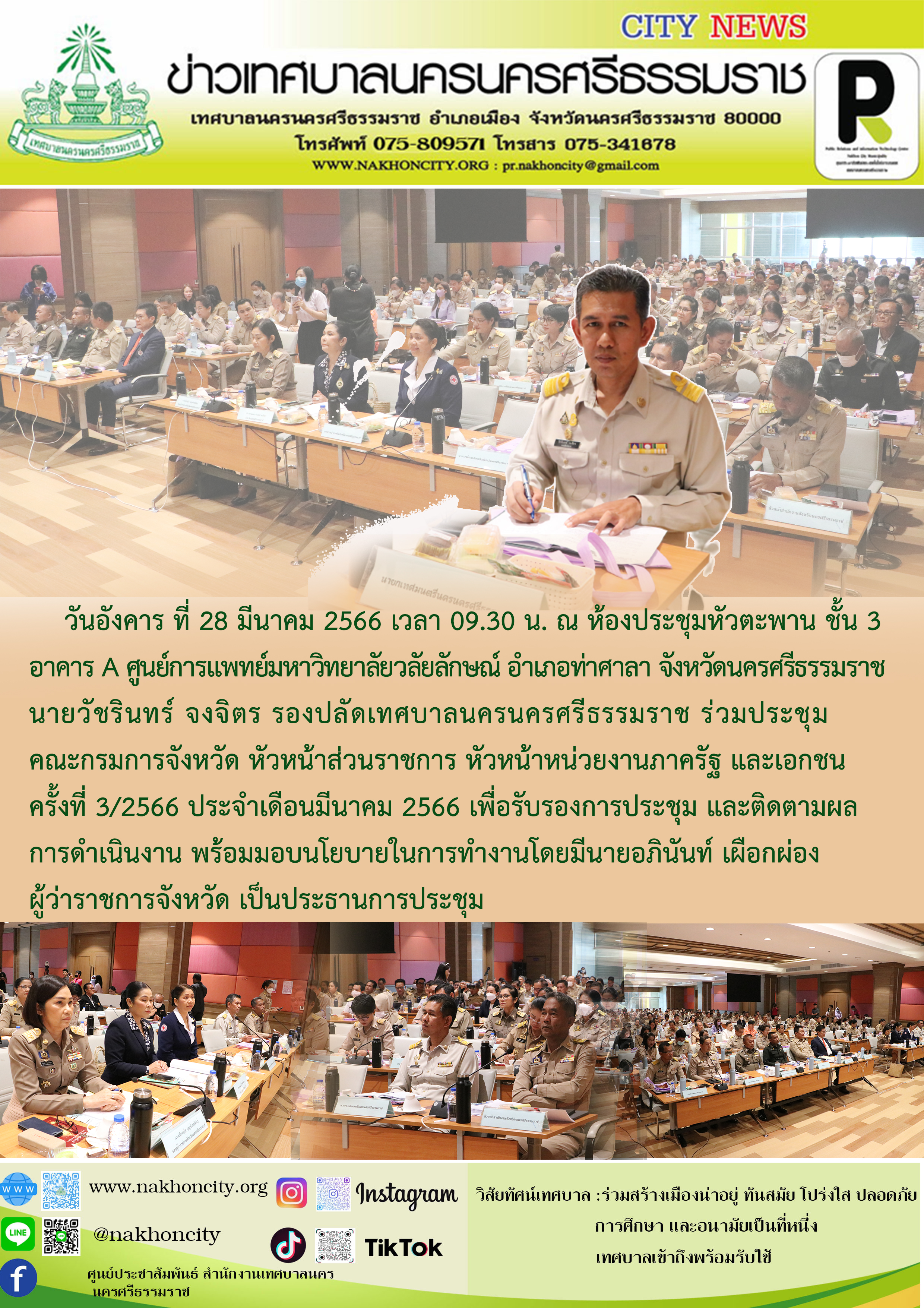 นายวัชรินทร์ จงจิตร รองปลัดเทศบาลนครนครศรีธรรมราช ร่วมประชุมคณะกรมการจังหวัด หัวหน้าส่วนราชการ หัวหน้าหน่วยงานภาครัฐ และเอกชน ครั้งที่ 3/2566 ประจำเดือนมีนาคม 2566 |