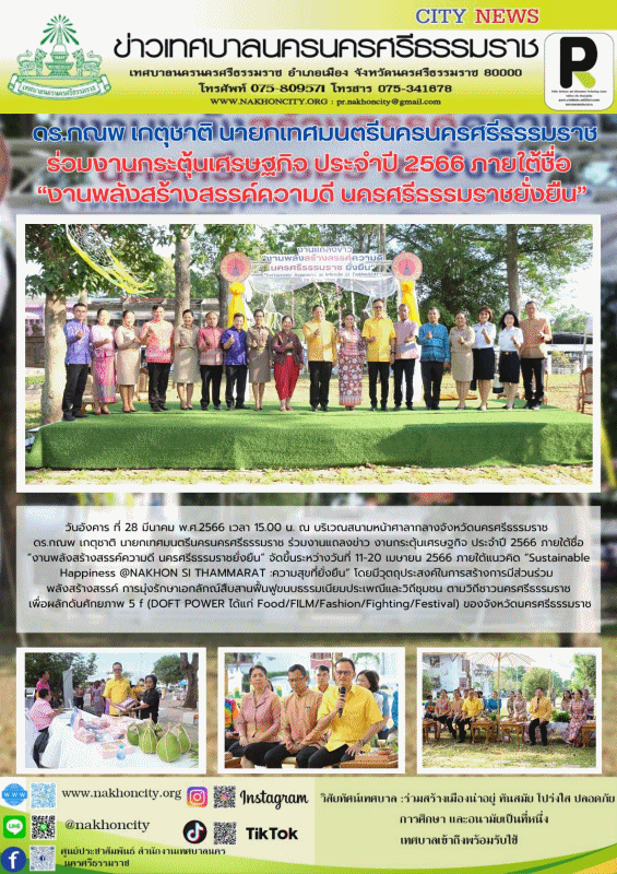 วันอังคาร ที่ 28 มีนาคม พ.ศ.2566 เวลา 15.00 น. ณ บริเวณสนามหน้าศาลากลางจังหวัดนครศรีธรรมราช ดร.กณพ เกตุชาติ นายกเทศมนตรีนครนครศรีธรรมราช ร่วมงานแถลงข่าว งานกระตุ้นเศรษฐกิจ ประจำปี 2566 ภายใต้ชื่อ “งานพลังสร้างสรรค์ความดี นครศรีธรรมราชยั่งยืน” จัดขึ้นระหว่างวันที่ 11-20 เมษายน 2566 ภายใต้แนวคิด “Sustainable Happiness @NAKHON SI THAMMARAT :ความสุขที่ยั่งยืน” โดยมีวุตถุประสงค์ในการสร้างการมีส่วนร่วม พลังสร้างสรรค์ การมุ่งรักษาเอกลักณ์สืบสานฟื้นฟูขนบธรรมเนียมประเพณีและวิถีชุมชน ตามวิถีชาวนครศรีธรรมราช เพื่อผลักดันศักยภาพ 5 f (DOFT POWER ได้แก่ Food/FILM/Fashion/Fighting/Festival) ของจังหวัดนครศรีธรรมราช อีกด้วย .......... ภาพ//ข่าว//จันทร์จิรา |