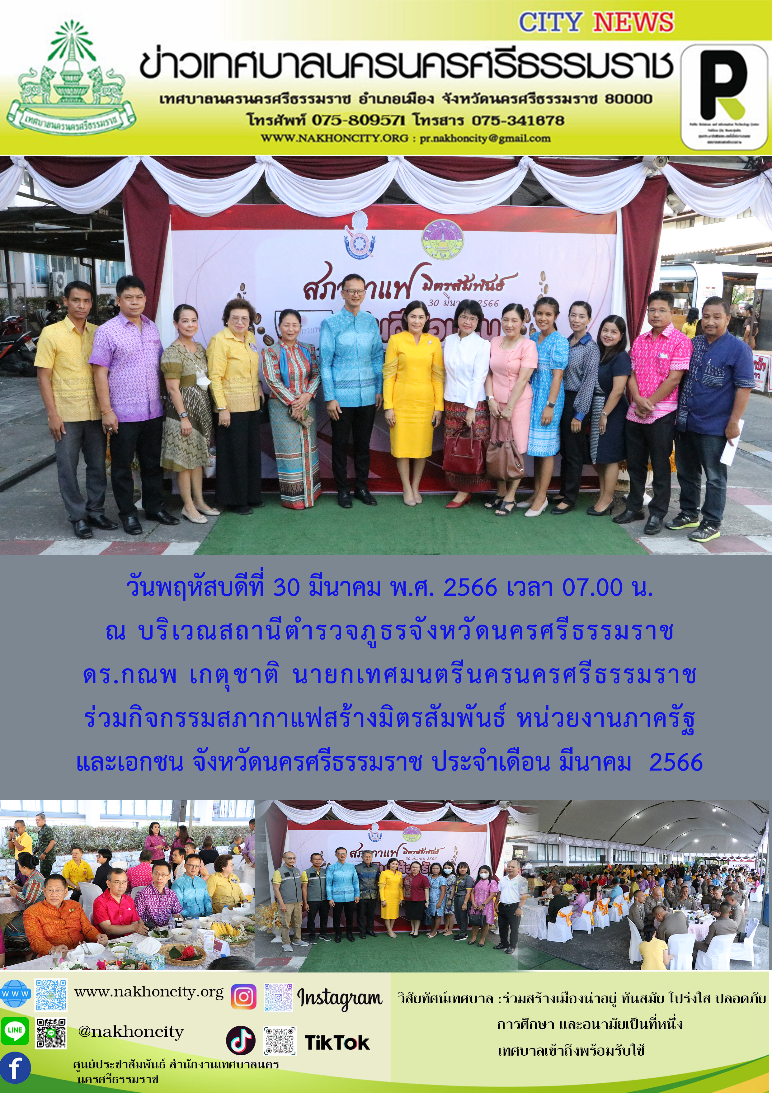 วันพฤหัสบดีที่ 30 มีนาคม พ.ศ. 2566 เวลา 07.00 น. ณ บริเวณสถานีตำรวจภูธรจังหวัดนครศรีธรรมราช ดร.กณพ เกตุชาติ นายกเทศมนตรีนครนครศรีธรรมราช ร่วมกิจกรรมสภากาแฟสร้างมิตรสัมพันธ์ หน่วยงานภาครัฐ และเอกชน จังหวัดนครศรีธรรมราช ประจำเดือน มีนาคม 2566 โดยมี นายอภินันท์ เผือกผ่อง ผู้ว่าราชการจังหวัดนครศรีธรรมราช เป็นประธานในกิจกรรม