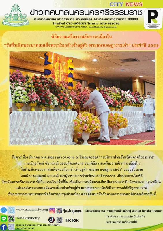 วันศุกร์ ที่31 มีนาคม พ.ศ.2566 เวลา 07.00 น. ณ หอประชุมโรงละคร องค์การบริหารส่วนจังหวัดนครศรีธรรมราช นายณัฏฐวัฒน์ จันทร์มณี รองปลัดเทศบาล ร่วมพิธีถวายเครื่องราชสักการะเนื่องใน “วันที่ระลึกพระบาทสมเด็จพระนั่งเกล้าเจ้าอยู่หัว พระมหาเจษฎาราชเจ้า” ประจำปี 2566 โดยมี นายสมพงษ์ มากมณี รองผู้ว่าราชการจังหวัดนครศรีธรรมราช เป็นประธานในพิธี จังหวัดนครศรีธรรมราช จัดกิจกรรมในครั้งนี้ขึ้น เพื่อเป็นการเฉลิมพระเกียรติและน้อมรำลึกถึงพระมหากรุณาธิคุณ แห่งองค์พระบาทสมเด็จพระนั่งเกล้าเจ้าอยู่หัว และพระมหากษัตริย์ในราชวงศ์จักรีทุกพระองค์ ที่ทรงประกอบพระราชกรณียกิจทำนุบำรุงบ้านเมือง ตลอดจนปกปักรักษาเอกราชของชาติมาจนถึงทุกวันนี้ ........... ภาพ//ข่าว//จันทร์จิรา |