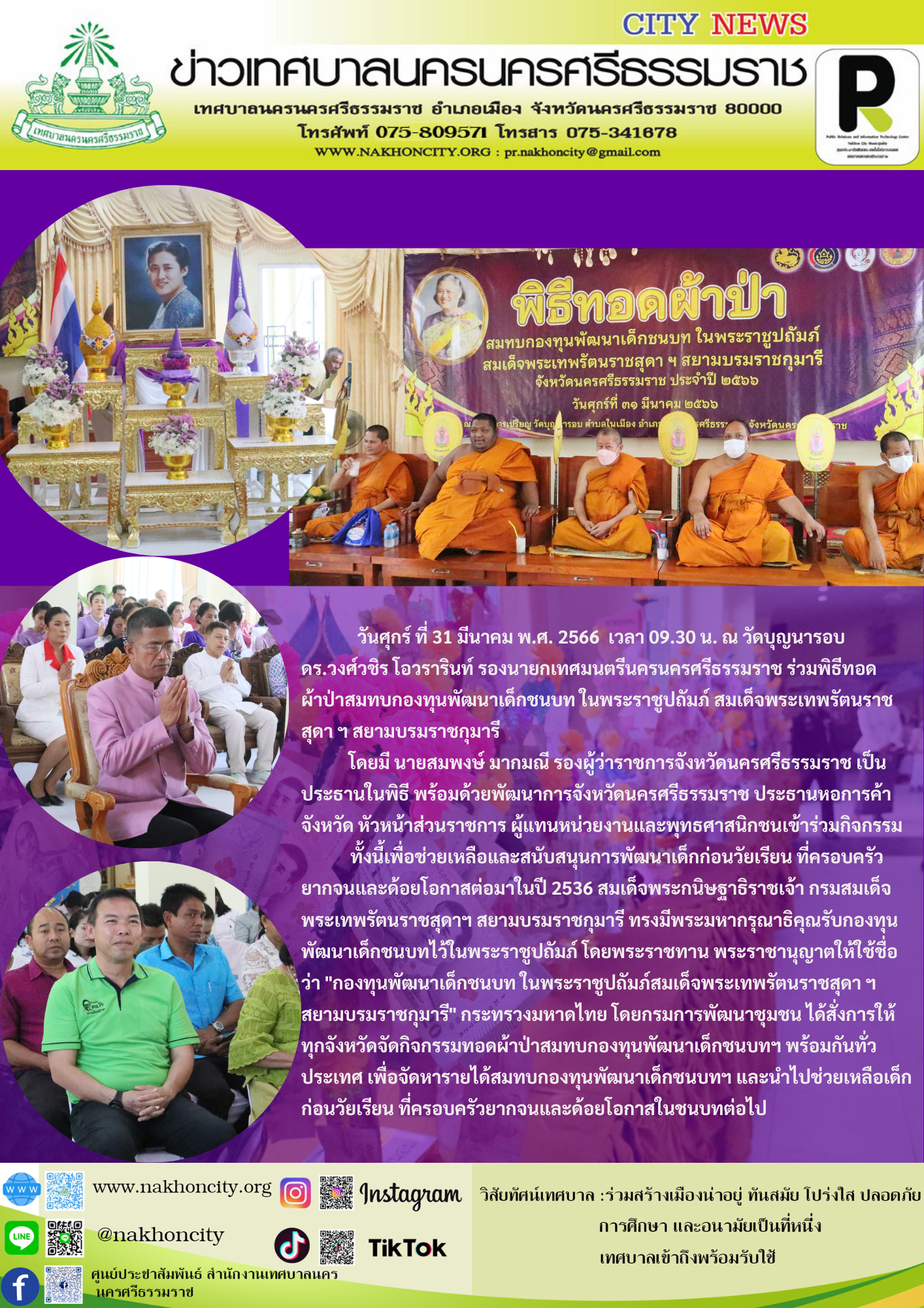 วันศุกร์ ที่ 31 มีนาคม พ.ศ. 2566 เวลา 09.30 น. ณ วัดบุญนารอบ ดร.วงศ์วชิร โอวรารินท์ รองนายกเทศมนตรีนครนครศรีธรรมราช ร่วมพิธีทอดผ้าป่าสมทบกองทุนพัฒนาเด็กชนบท ในพระราชูปถัมภ์ สมเด็จพระเทพรัตนราชสุดา ฯ สยามบรมราชกุมารี โดยมี นายสมพงษ์ มากมณี รองผู้ว่าราชการจังหวัดนครศรีธรรมราช เป็นประธานในพิธี พร้อมด้วยพัฒนาการจังหวัดนครศรีธรรมราช ประธานหอการค้าจังหวัด หัวหน้าส่วนราชการ ผู้แทนหน่วยงานและพุทธศาสนิกชนเข้าร่วมกิจกรรม ทั้งนี้เพื่อช่วยเหลือและสนับสนุนการพัฒนาเด็กก่อนวัยเรียน ที่ครอบครัวยากจนและด้อยโอกาสต่อมาในปี 2536 สมเด็จพระกนิษฐาธิราชเจ้า กรมสมเด็จพระเทพรัตนราชสุดาฯ สยามบรมราชกุมารี ทรงมีพระมหากรุณาธิคุณรับกองทุนพัฒนาเด็กชนบทไว้ในพระราชูปถัมภ์ โดยพระราชทาน พระราชานุญาตให้ใช้ชื่อว่า "กองทุนพัฒนาเด็กชนบท ในพระราชูปถัมภ์สมเด็จพระเทพรัตนราชสุดา ฯ สยามบรมราชกุมารี" กระทรวงมหาดไทย โดยกรมการพัฒนาชุมชน ได้สั่งการให้ ทุกจังหวัดจัดกิจกรรมทอดผ้าป่าสมทบกองทุนพัฒนาเด็กชนบทฯ พร้อมกันทั่วประเทศ เพื่อจัดหารายได้สมทบกองทุนพัฒนาเด็กชนบทฯ และนำไปช่วยเหลือเด็กก่อนวัยเรียน ที่ครอบครัวยากจนและด้อยโอกาสในชนบทต่อไป |