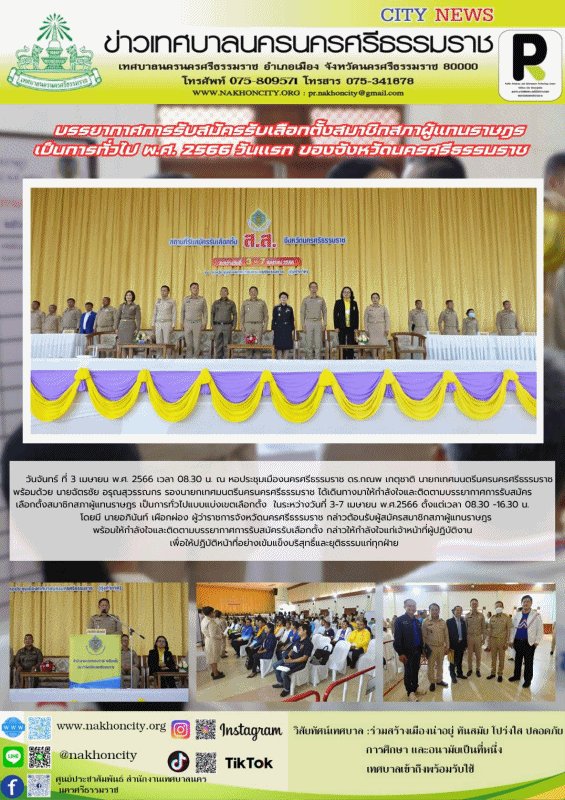 วันจันทร์ ที่ 3 เมษายน พ.ศ. 2566 เวลา 08.30 น. ณ หอประชุมเมืองนครศรีธรรมราช ดร.กณพ เกตุชาติ นายกเทศมนตรีนครนครศรีธรรมราช พร้อมด้วย นายฉัตรชัย อรุณสุวรรณกร รองนายกเทศมนตรีนครนครศรีธรรมราช ได้เดินทางมาให้กำลังใจและติดตามบรรยากาศการรับสมัคร |