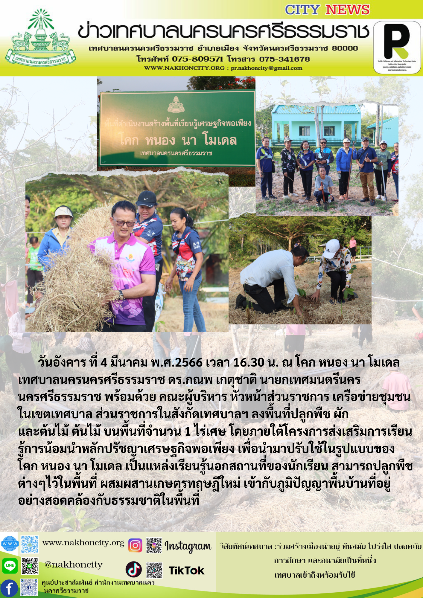 ดร.กณพ เกตุชาติ นายกเทศมนตรีนครนครศรีธรรมราช พร้อมด้วย คณะผู้บริหาร หัวหน้าส่วนราชการ ลงพื้นที่ปลูกพืช ผัก และต้นไม้ ต้นไม้ บนพื้นที่จำนวน 1 ไร่เศษ โดยภายใต้โครงการส่งเสริมการเรียนรู้การน้อมนำหลักปรัชญาเศรษฐกิจพอเพียง |