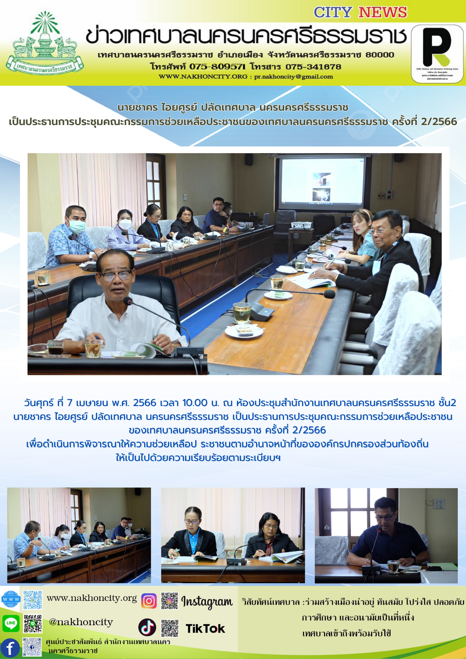 วันศุกร์ ที่ 7 เมษายน พ.ศ. 2566 เวลา 10.00 น. ณ ห้องประชุมสำนักงานเทศบาลนครนครศรีธรรมราช ชั้น2 นายชาคร ไอยศูรย์ ปลัดเทศบาล นครนครศรีธรรมราช เป็นประธานการประชุมคณะกรรมการช่วยเหลือประชาชนของเทศบาลนครนครศรีธรรมราช ครั้งที่ 2/2566 เพื่อดำเนินการพิจารณาให้ความช่วยเหลือ ประชาชนตามอำนาจหน้าที่ขององค์กรปกครองส่วนท้องถิ่น ให้เป็นไปด้วยความเรียบร้อยตามระเบียบฯ …………… ภาพ//ข่าว//จันทร์จิรา ตรวจทาน//ฐิตินันท์ |