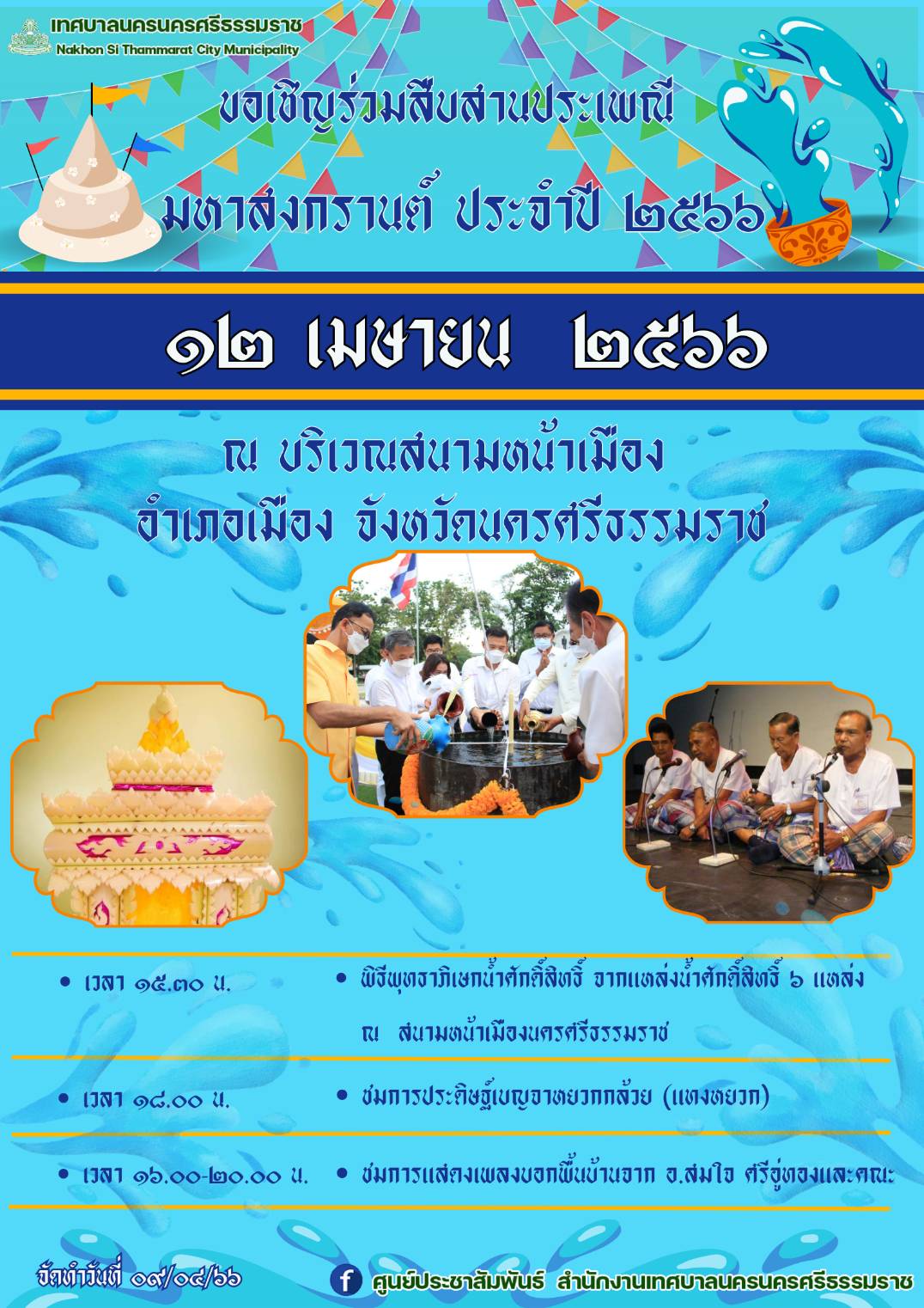 ขอเชิญร่วมสืบสานประเพณี มหาสงกรานต์ ประจำปี 2566 วันที่ 12 เมษายน 2566 ณ บริเวณสนามหน้าเมือง อำเภอเมือง จังหวัดนครศรีธรรมราช |
