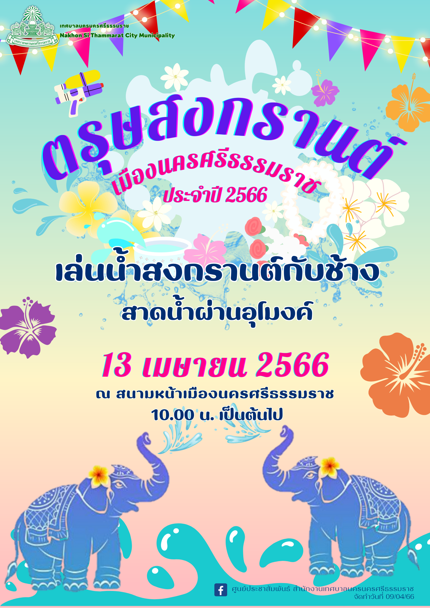 เทศบาลนครนครศรีธรรมราช ขอเชิญชวนเล่นน้ำสงกรานต์กับช้าง สาดน้ำผ่านอุโมงค์ ในวันที่ 13 เมษายน พ.ศ. 2566 ณ สนามหน้าเมืองนครศรีธรรมราช เวลา 10.00 น. เป็นต้นไป |