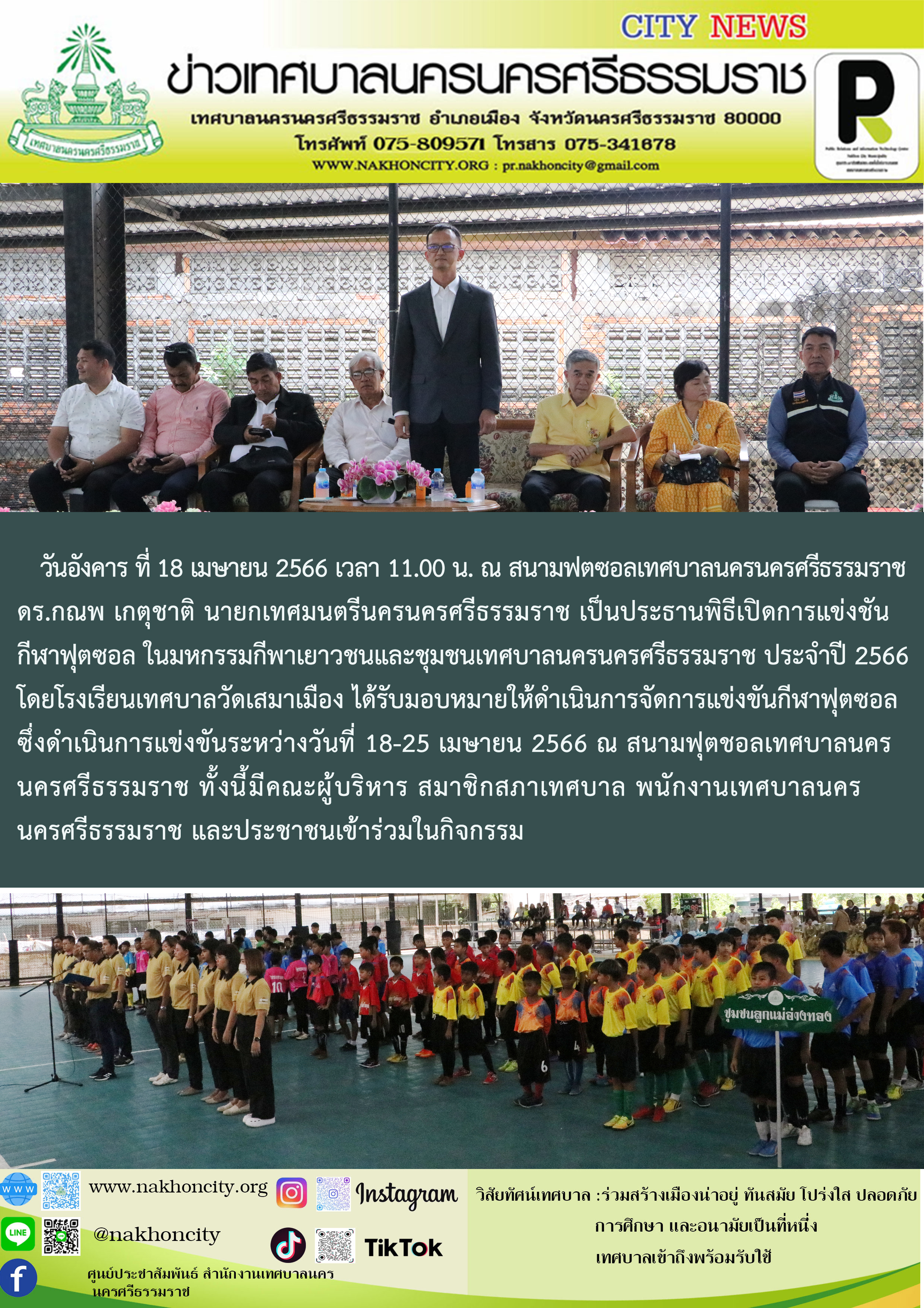 ดร.กณพ เกตุชาติ นายกเทศมนตรีนครนครศรีธรรมราช เป็นประธานพิธีเปิดการแข่งชันกีฬาฟุตซอล ในมหกรรมกีพาเยาวชนและชุมชนเทศบาลนครนครศรีธรรมราช ประจำปี 2566 |