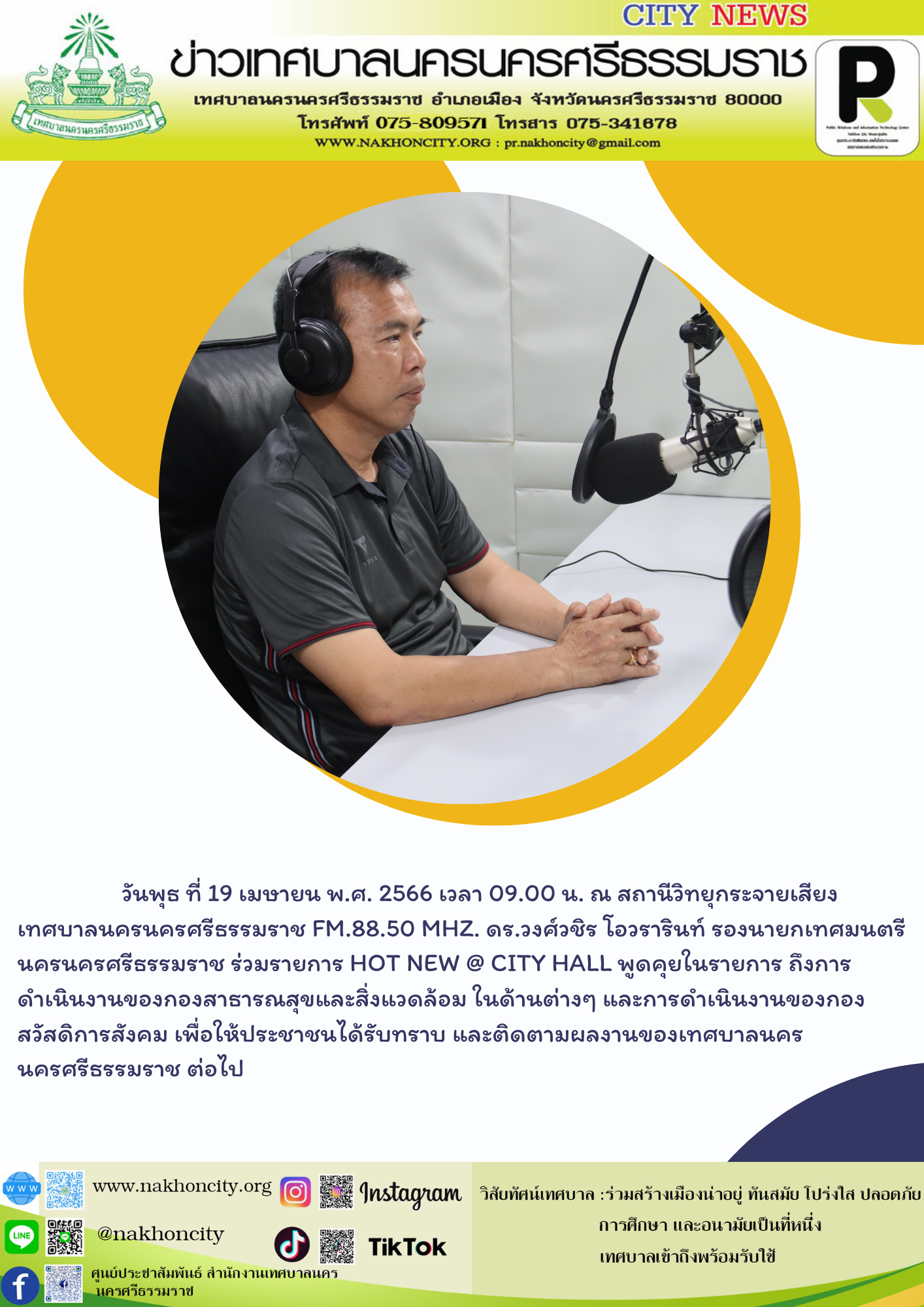 วันพุธ ที่ 19 เมษายน พ.ศ. 2566 เวลา 09.00 น. ณ สถานีวิทยุกระจายเสียง เทศบาลนครนครศรีธรรมราช FM.88.50 MHz. ดร.วงศ์วชิร โอวรารินท์ รองนายกเทศมนตรีนครนครศรีธรรมราช ร่วมรายการ Hot new @ City Hall พูดคุยในรายการ ถึงการดำเนินงานของกองสาธารณสุขและสิ่งแวดล้อม ในด้านต่างๆ และการดำเนินงานของกองสวัสดิการสังคม เพื่อให้ประชาชนได้รับทราบ และติดตามผลงานของเทศบาลนครนครศรีธรรมราช ต่อไป |
