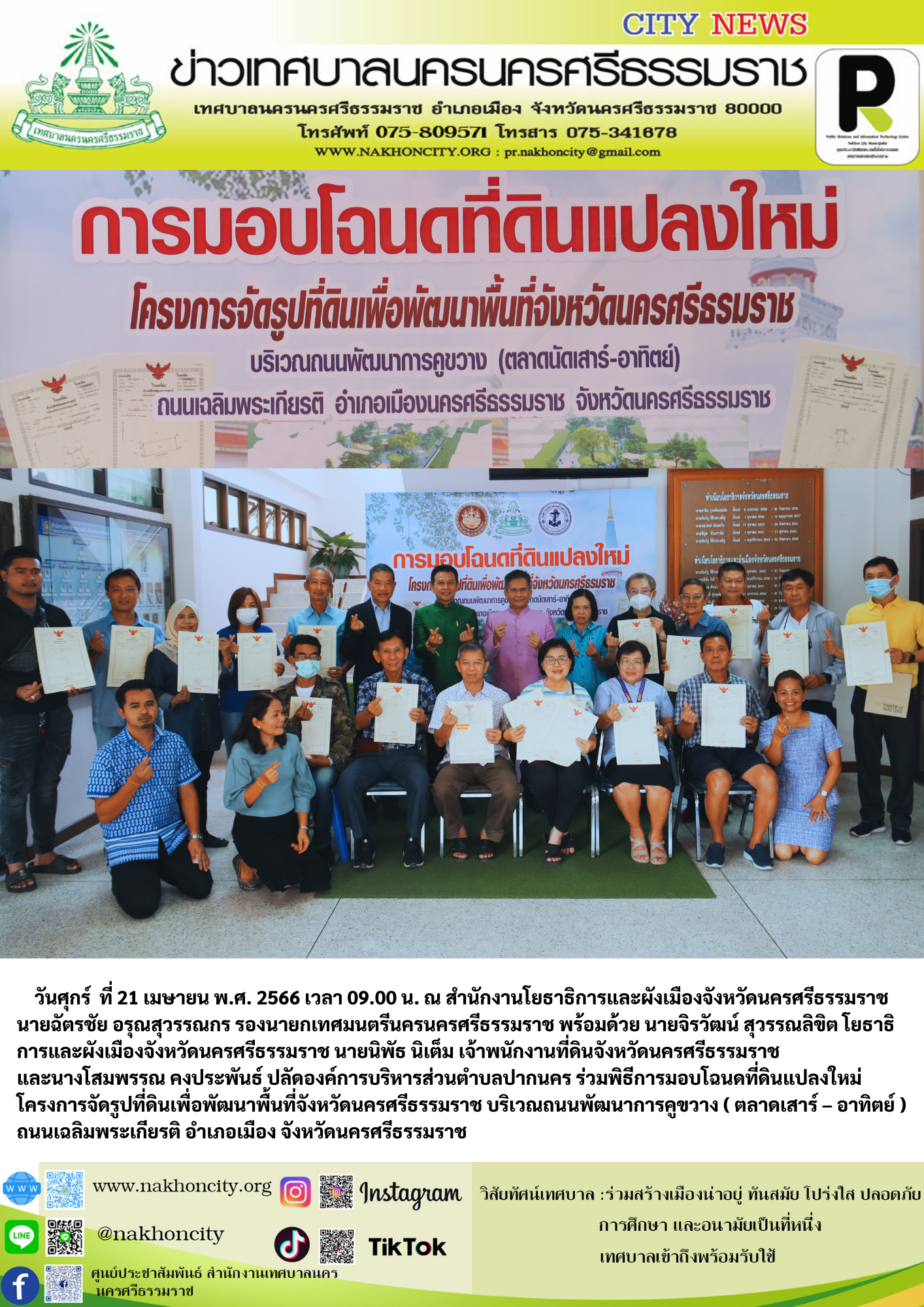 วันศุกร์ที่ 21 เมษายน พ.ศ. 2566 เวลา 09.00 น. ณ สำนักงานโยธาธิการและผังเมืองจังหวัดนครศรีธรรมราช นายฉัตรชัย อรุณสุวรรณกร รองนายกเทศมนตรีนครนครศรีธรรมราช พร้อมด้วย นายจิรวัฒน์ สุวรรณลิขิต โยธาธิการและผังเมืองจังหวัดนครศรีธรรมราช นายนิพัธ นิเต็ม เจ้าพนักงานที่ดินจังหวัดนครศรีธรรมราช และนางโสมพรรณ คงประพันธ์ ปลัดองค์การบริหารส่วนตำบลปากนคร ร่วมพิธีการมอบโฉนดที่ดินแปลงใหม่ โครงการจัดรูปที่ดินเพื่อพัฒนาพื้นที่จังหวัดนครศรีธรรมราช บริเวณถนนพัฒนาการคูขวาง ( ตลาดเสาร์ – อาทิตย์ ) ถนนเฉลิมพระเกียรติ อำเภอเมือง จังหวัดนครศรีธรรมราช