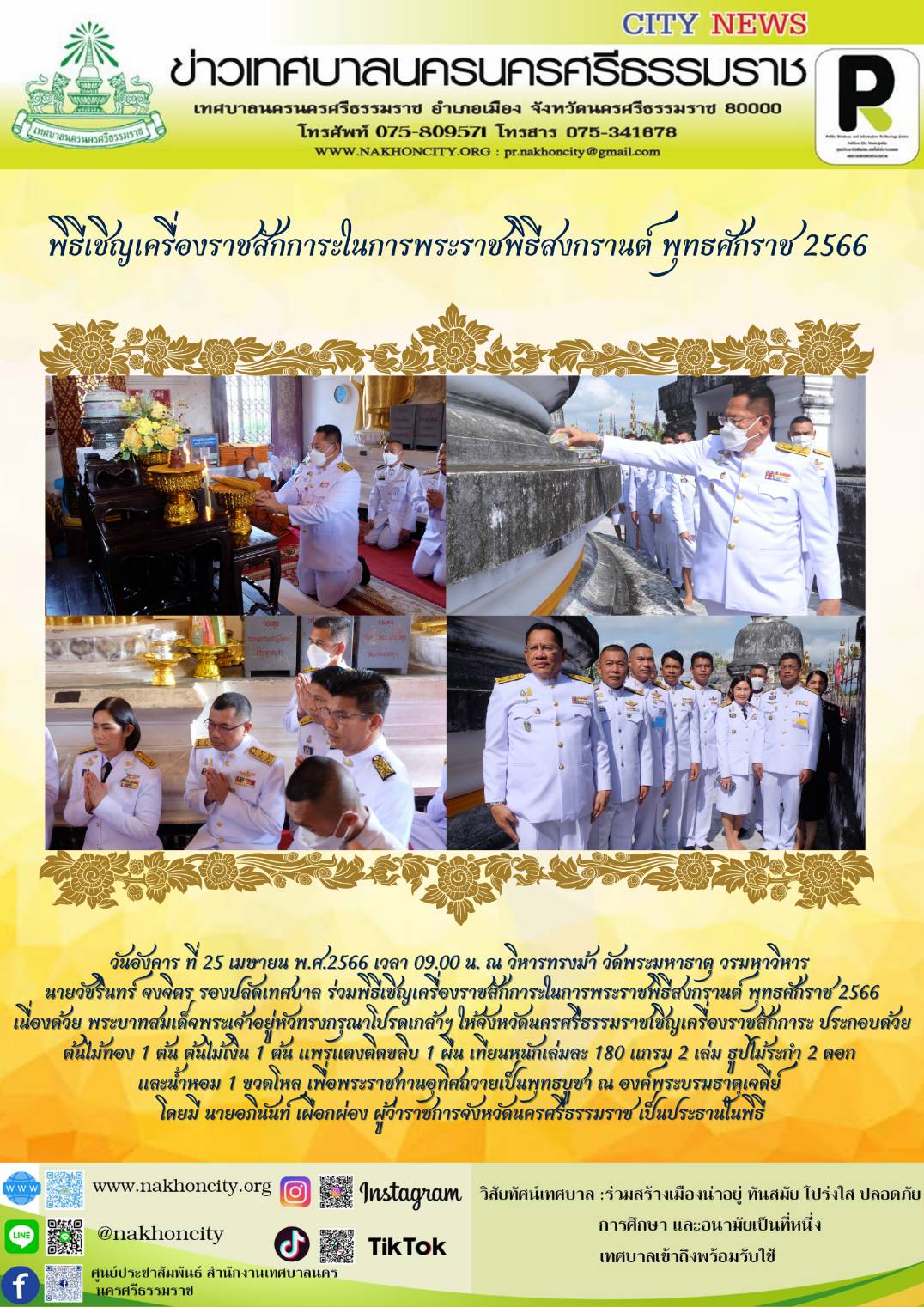 วันอังคาร ที่ 25 เมษายน พ.ศ.2566 เวลา 09.00 น. ณ วิหารทรงม้า วัดพระมหาธาตุ วรมหาวิหาร นายวัชรินทร์ จงจิตร รองปลัดเทศบาล ร่วมพิธีเชิญเครื่องราชสักการะในการพระราชพิธีสงกรานต์ พุทธศักราช 2566 เนื่องด้วย พระบาทสมเด็จพระเจ้าอยู่หัวทรงกรุณาโปรดเกล้าฯ ให้จังหวัดนครศรีธรรมราชเชิญเครื่องราชสักการะ ประกอบด้วย ต้นไม้ทอง 1 ต้น ต้นไม้เงิน 1 ต้น แพรแดงติดขลิบ 1 ผืน เทียนหนักเล่มละ 180 แกรม 2 เล่ม ธูปไม้ระกำ 2 ดอก และน้ำหอม 1 ขวดโหล เพื่อพระราชทานอุทิศถวายเป็นพุทธบูชา ณ องค์พระบรมธาตุเจดีย์ โดยมี นายอภินันท์ เผือกผ่อง ผู้ว่าราชการจังหวัดนครศรีธรรมราช เป็นประธานในพิธี ......... ภาพ//ข่าว//จันทร์จิรา ตรวจทาน//ฐิตินันท์ |