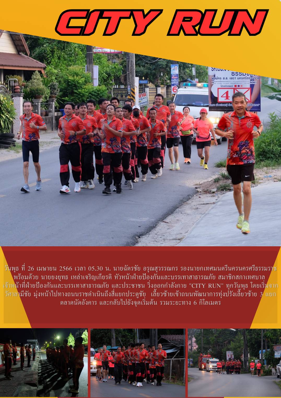นายฉัตรชัย อรุณสุวรรณกร รองนายกเทศมนตรีนครนครศรีธรรมราช พร้อมด้วยนายยงยุทธ เหล่าเจริญเกียรติ หัวหน้าฝ่ายป้องกันและบรรเทาสาธารณภัย สมาชิกสภาเทศบาล เจ้าหน้าที่ฝ่ายป้องกันและบรรเทาสาธารณภัย ประชาชนทั่วไป วิ่งออกกำลังกาย "CITY RUN" ทุกวันพุธ |
