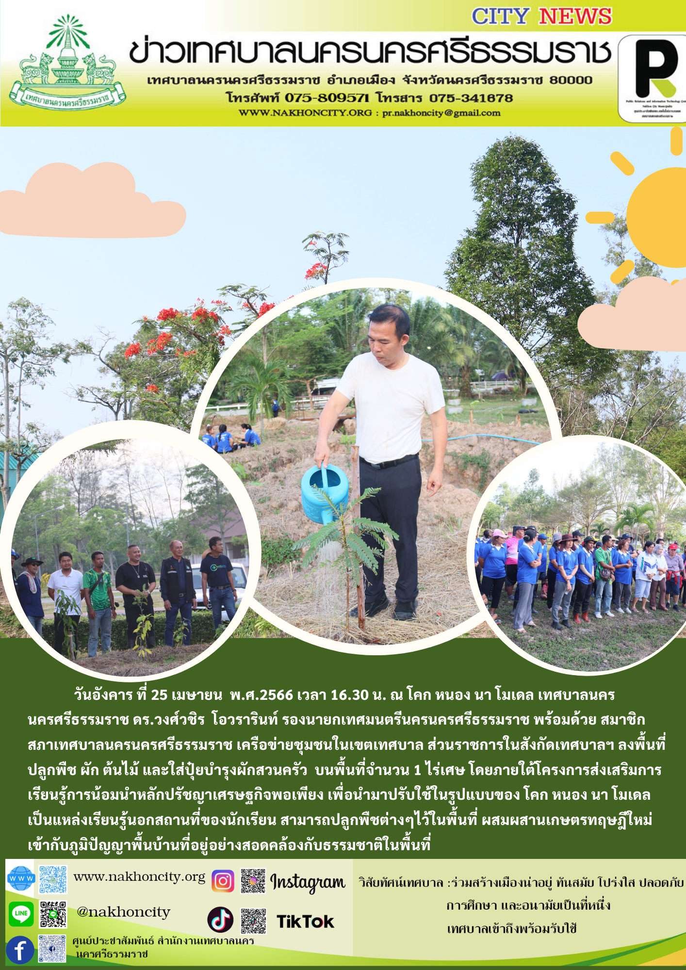 วันอังคาร ที่ 25 เมษายน พ.ศ.2566 เวลา 16.30 น. ณ โคก หนอง นา โมเดล เทศบาลนครนครศรีธรรมราช ดร.วงศ์วชิร โอวรารินท์ รองนายกเทศมนตรีนครนครศรีธรรมราช พร้อมด้วย สมาชิกสภาเทศบาลนครนครศรีธรรมราช เครือข่ายชุมชนในเขตเทศบาล ส่วนราชการในสังกัดเทศบาลฯ ลงพื้นที่ปลูกพืช ผัก ต้นไม้ และใส่ปุ๋ยบำรุงผักสวนครัว บนพื้นที่จำนวน 1 ไร่เศษ โดยภายใต้โครงการส่งเสริมการเรียนรู้การน้อมนำหลักปรัชญาเศรษฐกิจพอเพียง เพื่อนำมาปรับใช้ในรูปแบบของ โคก หนอง นา โมเดล เป็นแหล่งเรียนรู้นอกสถานที่ของนักเรียน สามารถปลูกพืชต่างๆไว้ในพื้นที่ ผสมผสานเกษตรทฤษฎีใหม่ เข้ากับภูมิปัญญาพื้นบ้านที่อยู่อย่างสอดคล้องกับธรรมชาติในพื้นที่ |