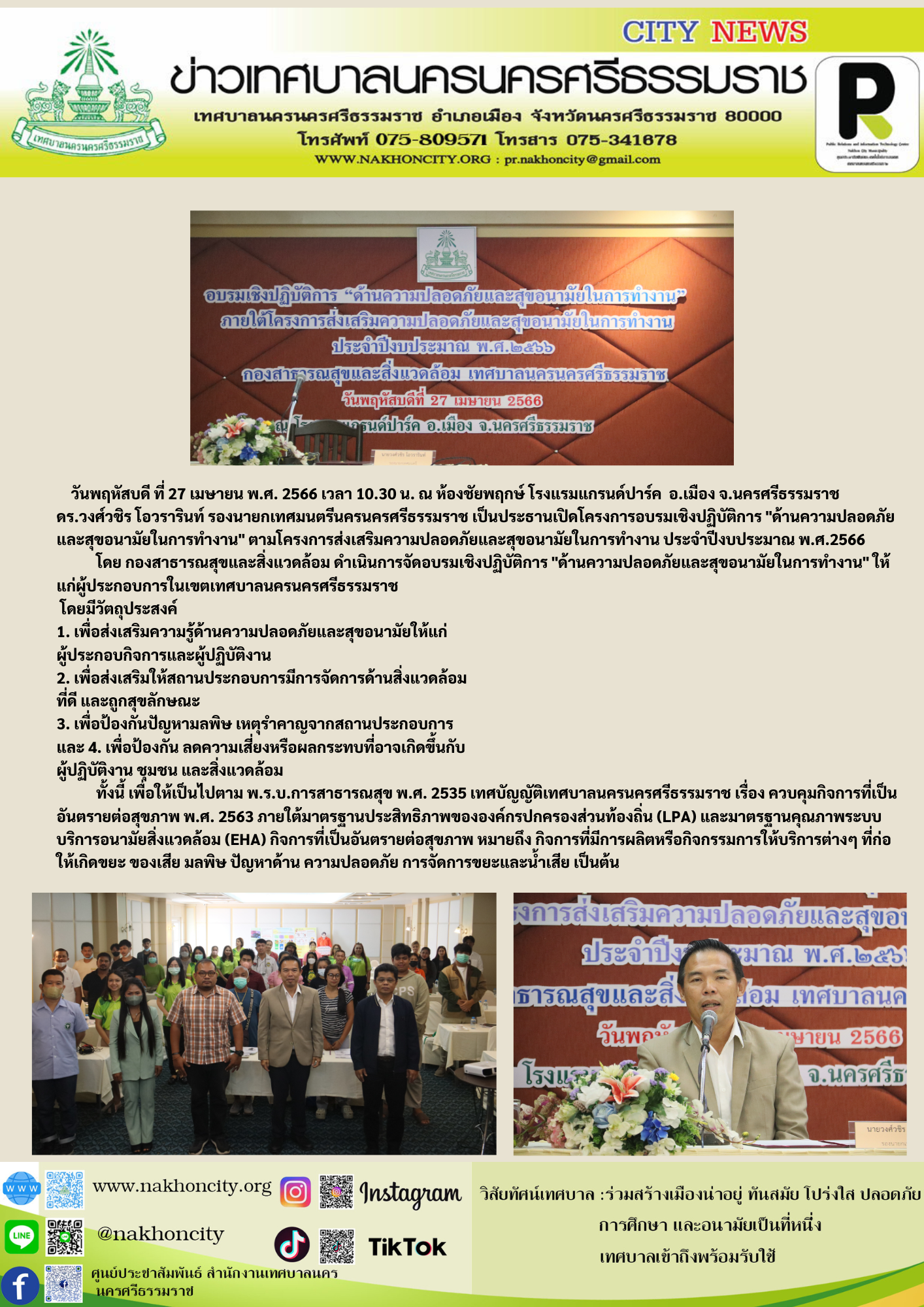วันพฤหัสบดีที่ 27 เมษายน พ.ศ. 2566 เวลา 10.30 น. ณ ห้องชัยพฤกษ์ โรงแรมแกรนด์ปาร์ค ดร.วงศ์วชิร โอวรารินท์ รองนายกเทศมนตรีนครนครศรีธรรมราช เป็นประธานเปิดโครงการอบรมเชิงปฏิบัติการ "ด้านความปลอดภัยและสุขอนามัยในการทำงาน" ตามโครงการส่งเสริมความปลอดภัยและสุขอนามัยในการทำงาน ประจำปีงบประมาณ พ.ศ.2566 โดย กองสาธารณสุขและสิ่งแวดล้อม ดำเนินการจัดอบรมเชิงปฏิบัติการ "ด้านความปลอดภัยและสุขอนามัยในการทำงาน" ให้แก่ผู้ประกอบการในเขตเทศบาลนครนครศรีธรรมราช โดยมีวัตถุประสงค์ 1. เพื่อส่งเสริมความรู้ด้านความปลอดภัยและสุขอนามัยให้แก่ ผู้ประกอบกิจการและผู้ปฏิบัติงาน 2. เพื่อส่งเสริมให้สถานประกอบการมีการจัดการด้านสิ่งแวดล้อม ที่ดี และถูกสุขลักษณะ 3. เพื่อป้องกันปัญหามลพิษ เหตุรำคาญจากสถานประกอบการ และ 4. เพื่อป้องกัน ลดความเสี่ยงหรือผลกระทบที่อาจเกิดขึ้นกับ ผู้ปฏิบัติงาน ชุมชน และสิ่งแวดล้อม ทั้งนี้ เพื่อให้เป็นไปตาม พ.ร.บ.การสาธารณสุข พ.ศ. 2535 เทศบัญญัติเทศบาลนครนครศรีธรรมราช เรื่อง ควบคุมกิจการที่เป็นอันตรายต่อสุขภาพ พ.ศ. 2563 ภายใต้มาตรฐานประสิทธิภาพขององค์กรปกครองส่วนท้องถิ่น (LPA) และมาตรฐานคุณภาพระบบบริการอนามัยสิ่งแวดล้อม (EHA) กิจการที่เป็นอันตรายต่อสุขภาพ หมายถึง กิจการที่มีการผลิตหรือกิจกรรมการให้บริการต่างๆ ที่ก่อให้เกิดขยะ ของเสีย มลพิษ ปัญหาด้าน ความปลอดภัย การจัดการขยะและน้ำเสีย เป็นต้น