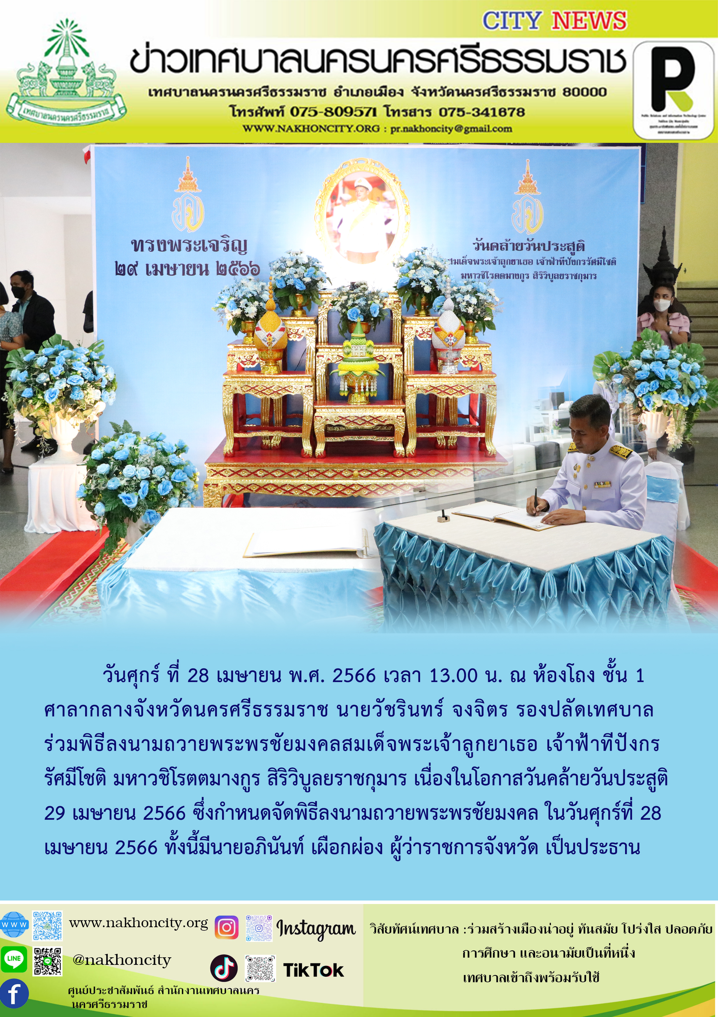 รองปลัดเทศบาลนครนครศรีธรรมราช ร่วมพิธีลงนามถวายพระพรชัยมงคลสมเด็จพระเจ้าลูกยาเธอ เจ้าฟ้าทีปังกรรัศมีโชติ มหาวชิโรตตมางกูร สิริวิบูลยราชกุมาร เนื่องในโอกาสวันคล้ายวันประสูติ 29 เมษายน 2566 |