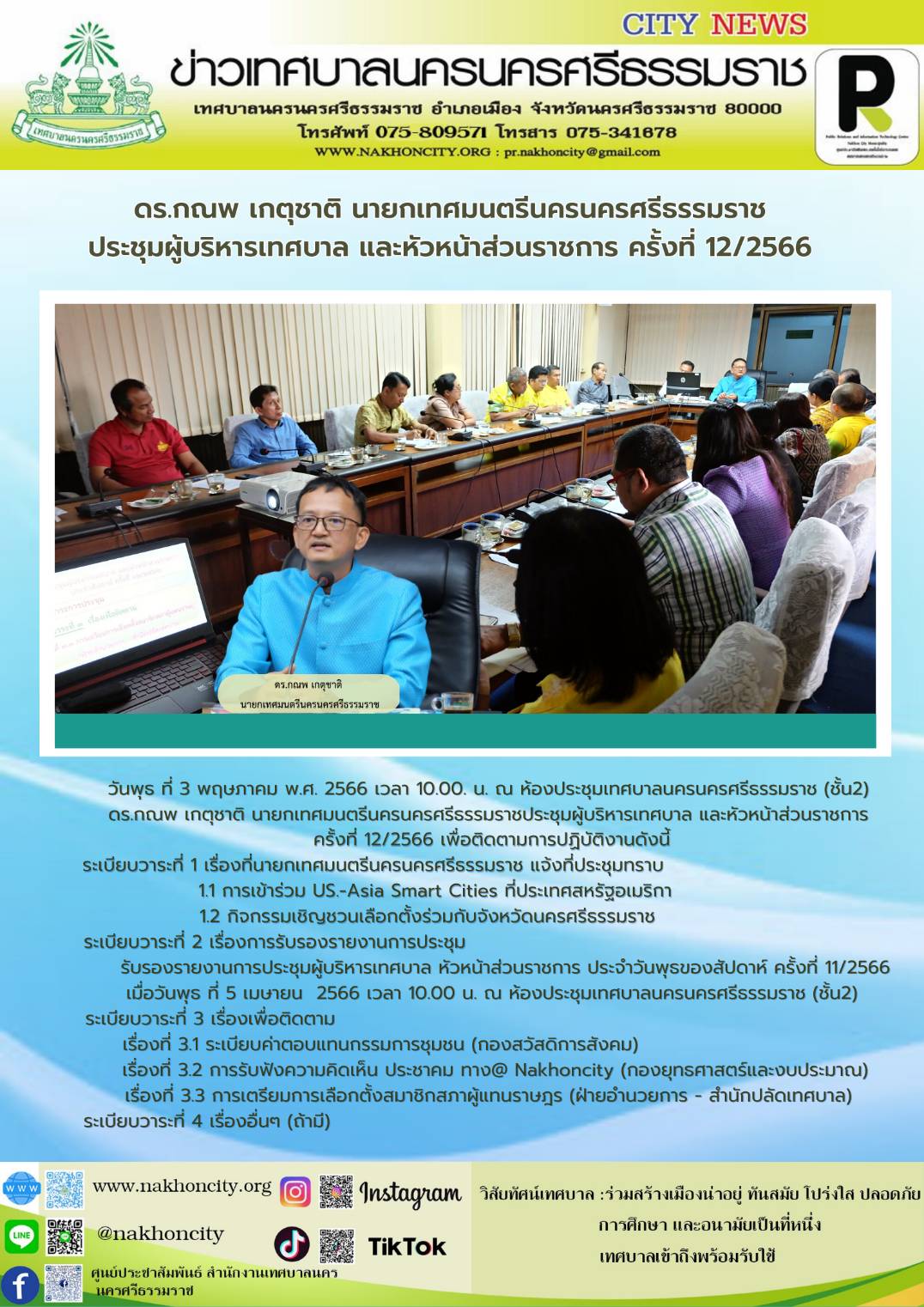 วันพุธ ที่ 3 พฤษภาคม พ.ศ. 2566 เวลา 10.00. น. ณ ห้องประชุมเทศบาลนครนครศรีธรรมราช (ชั้น2) ดร.กณพ เกตุชาติ นายกเทศมนตรีนครนครศรีธรรมราช ประชุมผู้บริหารเทศบาล และหัวหน้าส่วนราชการ ครั้งที่ 12/2566 เพื่อติดตามการปฏิบัติงานดังนี้ ระเบียบวาระที่ 1 เรื่องที่นายกเทศมนตรีนครนครศรีธรรมราช แจ้งที่ประชุมทราบ