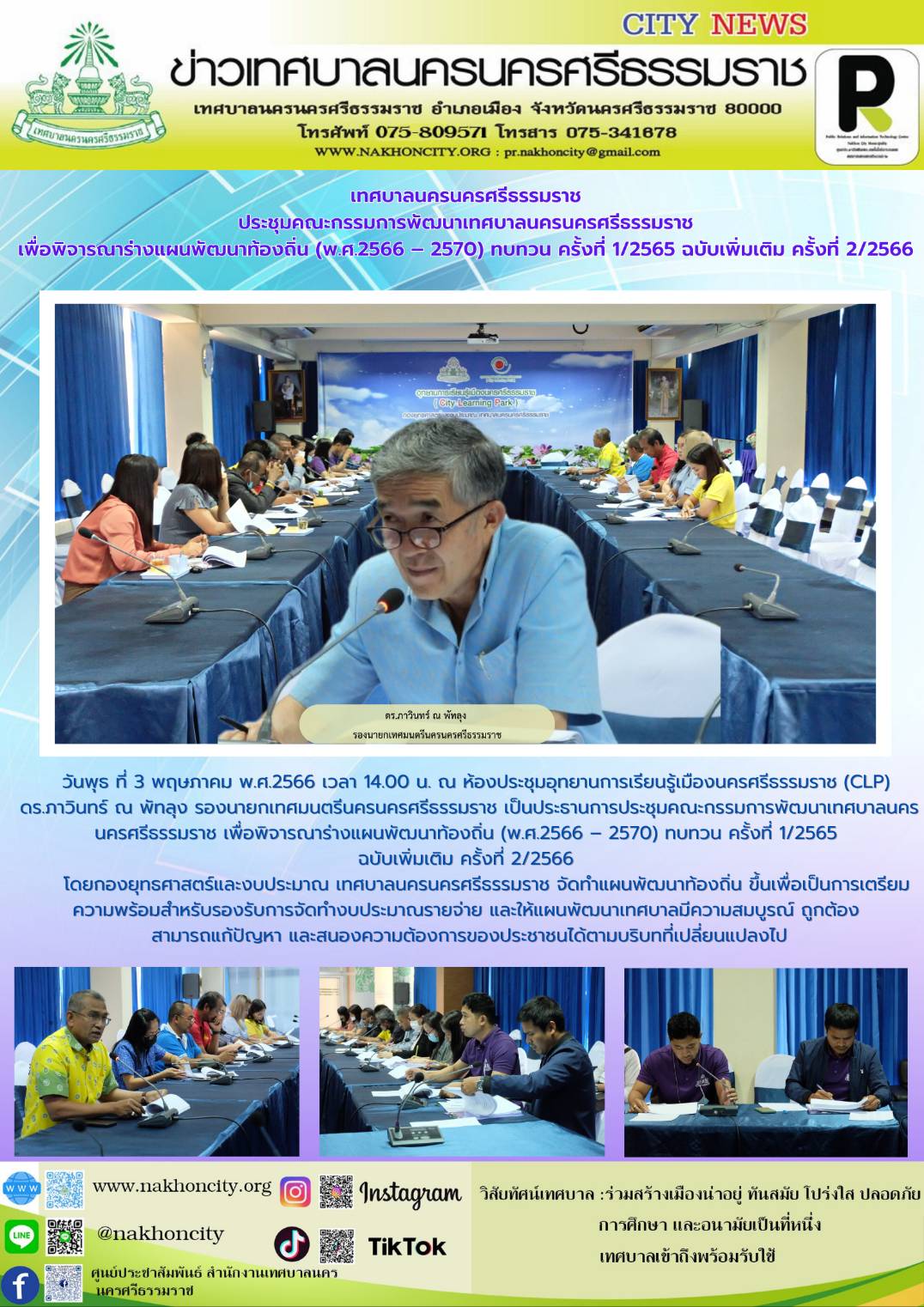 เทศบาลนครนครศรีธรรมราช ประชุมคณะกรรมการพัฒนาเทศบาลนครนครศรีธรรมราช เพื่อพิจารณาร่างแผนพัฒนาท้องถิ่น (พ.ศ.2566 – 2570) ทบทวน ครั้งที่ 1/2565 ฉบับเพิ่มเติม ครั้งที่ 2/2566 |