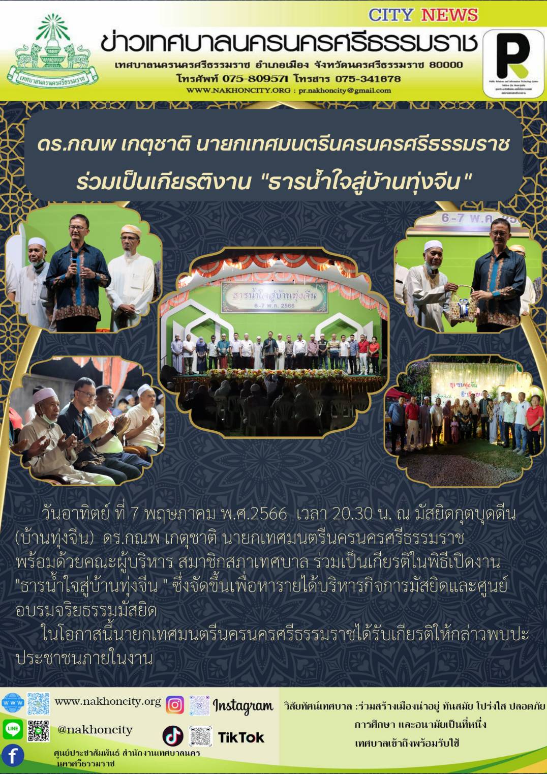 วันอาทิตย์ ที่ 7 พฤษภาคม พ.ศ.2566 เวลา 20.30 น. ณ มัสยิดกุตบุดดีน (บ้านทุ่งจีน) ดร.กณพ เกตุชาติ นายกเทศมนตรีนครนครศรีธรรมราช พร้อมด้วยคณะผู้บริหาร สมาชิกสภาเทศบาล ร่วมเป็นเกียรติในพิธีเปิดงาน "ธารน้ำใจสู่บ้านทุ่งจีน ซึ่งจัดขึ้นเพื่อหารายได้บริหารกิจการมัสยิดและศูนย์อบรมจริยธรรมมัสยิด |