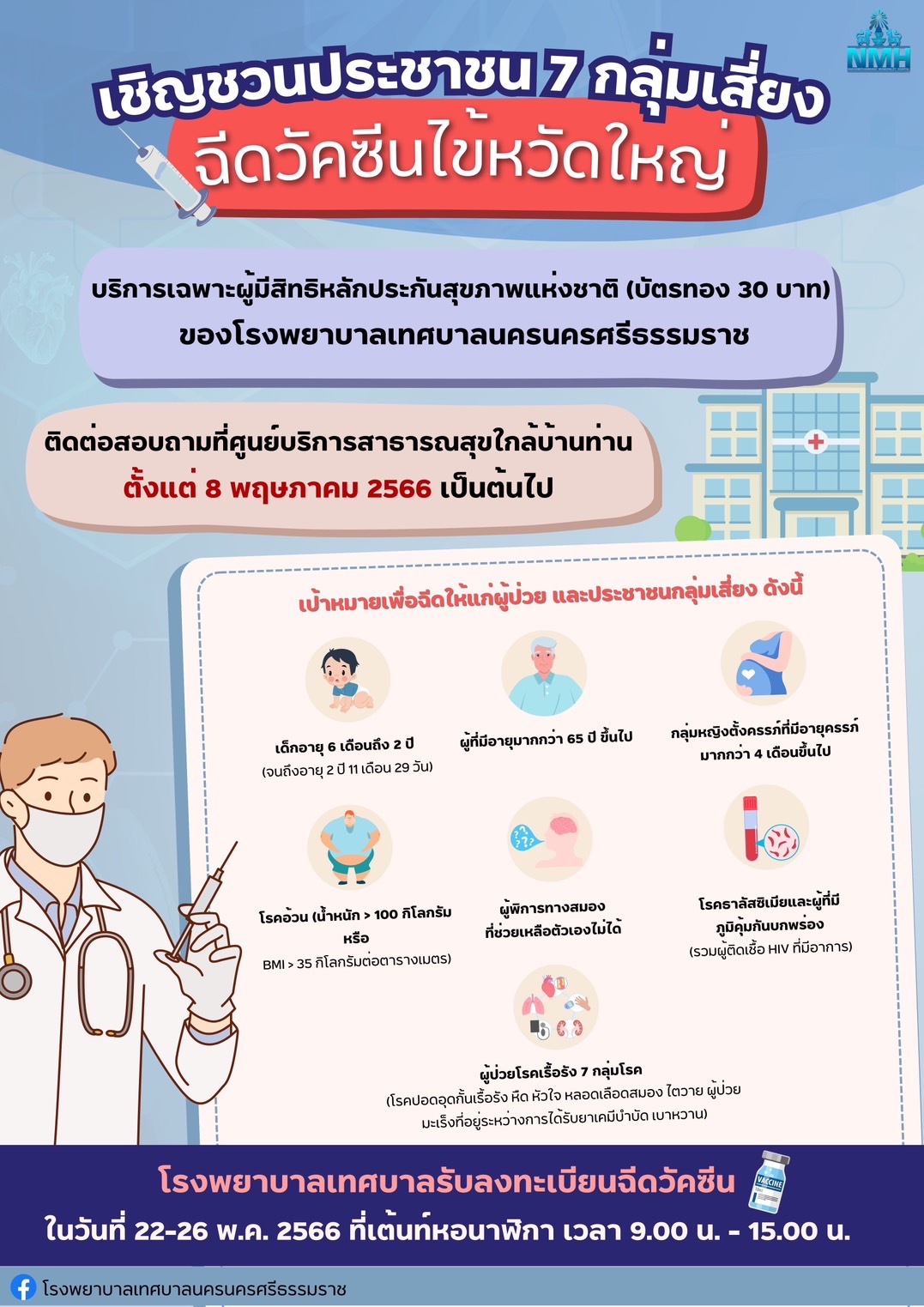 เทศบาลนครนครศรีธรรมราช ภายใต้การบริหารงานโดย ดร. กณพ เกตุชาติ นายกเทศมนตรีนครนครศรีธรรมราช โดยโรงพยาบาลเทศบาลนครนครศรีธรรมราช ขอเชิญชวนประชาชน ฉีดวัคซีนไข้หวัดใหญ่ โดยให้ผู้ที่อยู่ในกลุ่มเป้าหมาย ที่ยังไม่ได้ฉีดวัคซีน ไข้หวัดใหญ่ ภายใน 1 ปีที่ผ่านมา ท่านสามารถติดต่อ สอบถามที่ศูนย์บริการสาธารณสุขใกล้บ้านได้ในวันราชการ เวลา 08.30 น. - 15.00 น. และโรงพยาบาลเทศบาลรับลงทะเบียนฉีดวัคซีน ในวันที่ 22 -26 พ.ค.66 เวลา 09.00 น. - 15.00 น. ณ เต็นท์หอนาฬิกา สำหรับ กลุ่มเป้าหมายเฉพาะสิทธิบัตรทอง โรงพยาบาลเทศบาลนครนครศรีธรรมราช ดังนี้