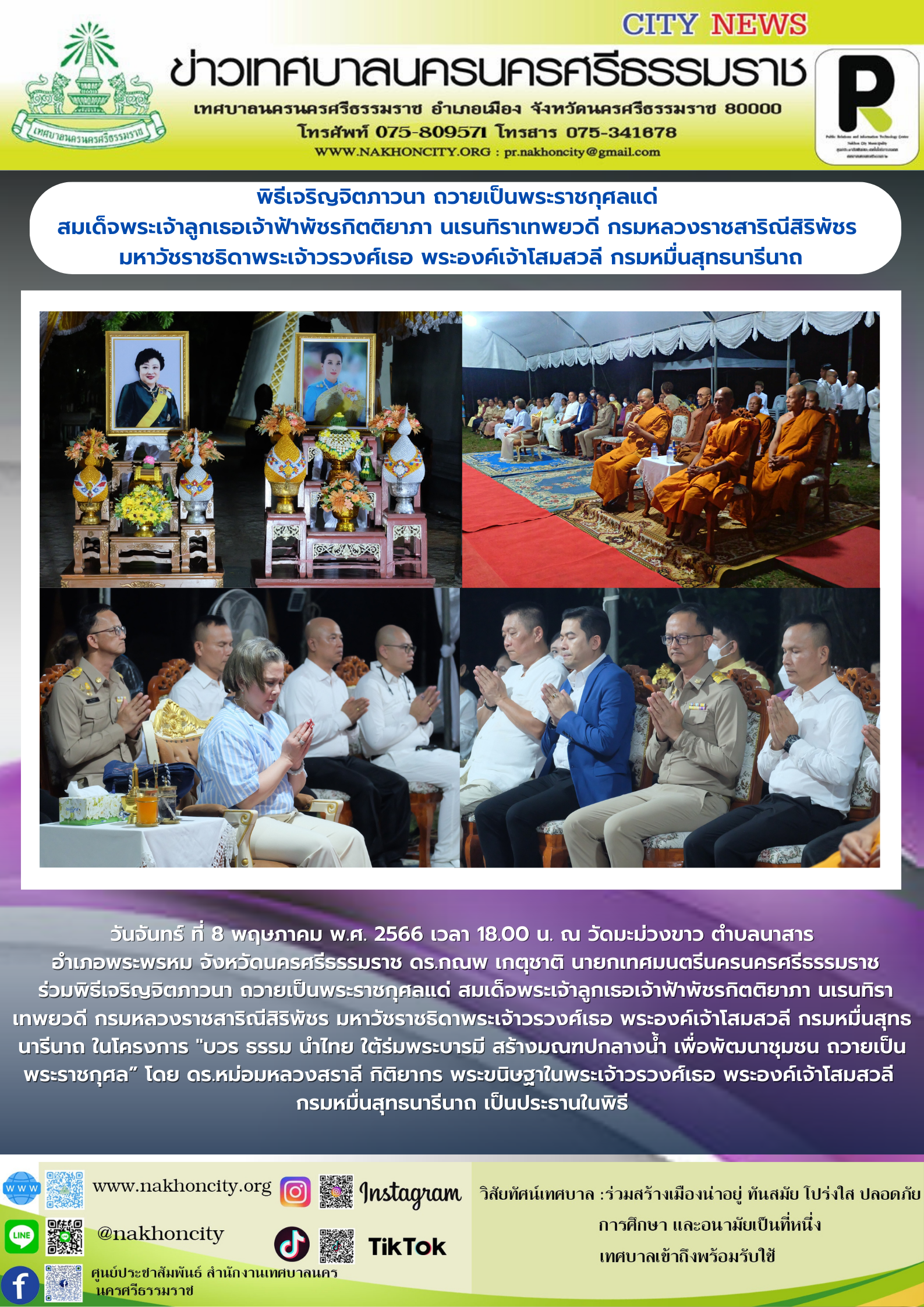 วันจันทร์ ที่ 8 พฤษภาคม พ.ศ. 2566 เวลา 18.00 น. ณ วัดมะม่วงขาว ตำบลนาสาร อำเภอพระพรหม จังหวัดนครศรีธรรมราช ดร.กณพ เกตุชาติ นายกเทศมนตรีนครนครศรีธรรมราช ร่วมพิธีเจริญจิตภาวนา ถวายเป็นพระราชกุศลแด่ สมเด็จพระเจ้าลูกเธอเจ้าฟ้าพัชรกิตติยาภา นเรนทิราเทพยวดี กรมหลวงราชสาริณีสิริพัชร มหาวัชราชธิดาพระเจ้าวรวงศ์เธอ พระองค์เจ้าโสมสวลี กรมหมื่นสุทธนารีนาถ ในโครงการ "บวร ธรรม นำไทย ใต้ร่มพระบารมี สร้างมณฑปกลางน้ำ เพื่อพัฒนาชุมชน ถวายเป็นพระราชกุศล” โดย ดร.หม่อมหวงสราลี กิติยากร พระขนิษฐาในพระเจ้าวรวงศ์เธอ พระองค์เจ้าโสมสวลี กรมหมื่นสุทธนารีนาถ เป็นประธานในพิธี .............. ภาพ//ข่าว//จันทร์จิรา |