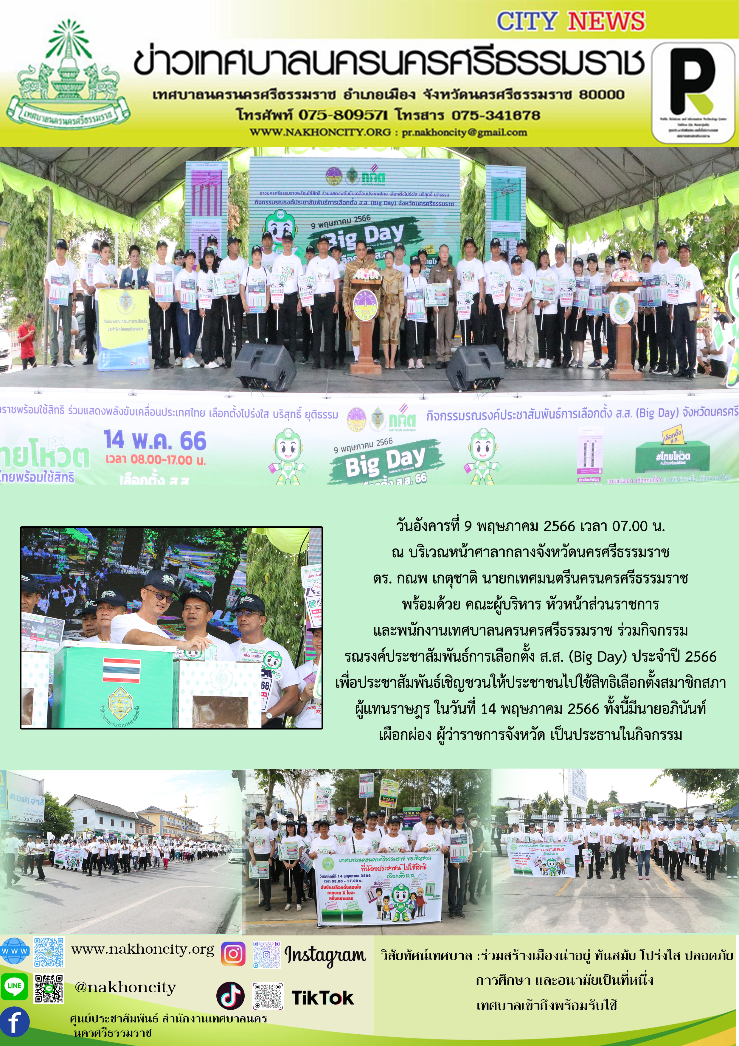 ดร. กณพ เกตุชาติ นายกเทศมนตรีนครนครศรีธรรมราช พร้อมด้วย คณะผู้บริหาร หัวหน้าส่วนราชการ และพนักงานเทศบาลนครนครศรีธรรมราช ร่วมกิจกรรม รณรงค์ประชาสัมพันธ์การเลือกตั้ง ส.ส. (Big Day) ประจำปี 2566 |