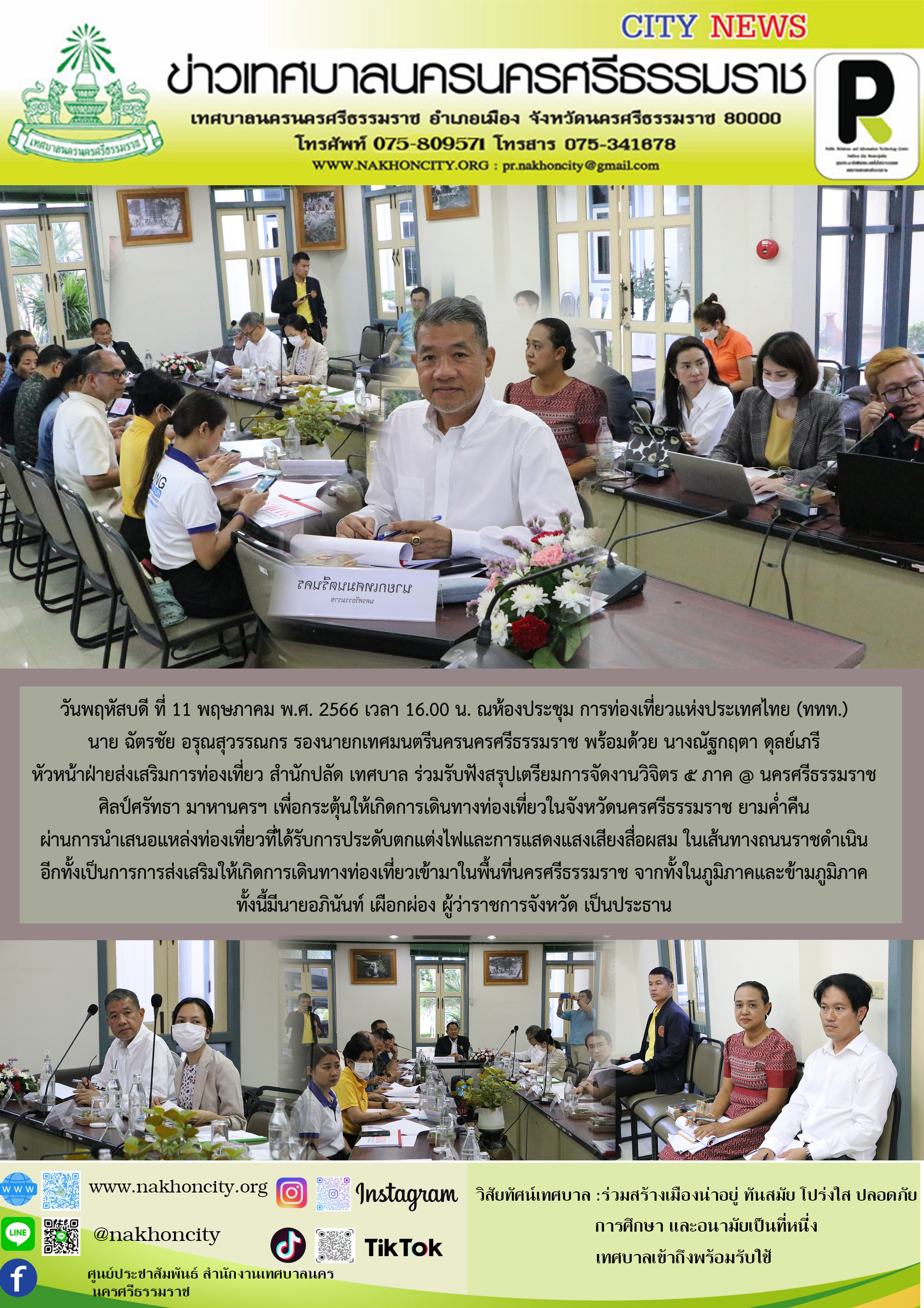 นาย ฉัตรชัย อรุณสุวรรณกร รองนายกเทศมนตรีนครนครศรีธรรมราช พร้อมด้วย นางณัฐกฤตา ดุลย์เภรี หัวหน้าฝ่ายส่งเสริมการท่องเที่ยว สำนักปลัด เทศบาล ร่วมรับฟังสรุปเตรียมการจัดงานวิจิตร ๕ ภาค @ นครศรีธรรมราช ศิลป์ศรัทธา มาหานครฯ |