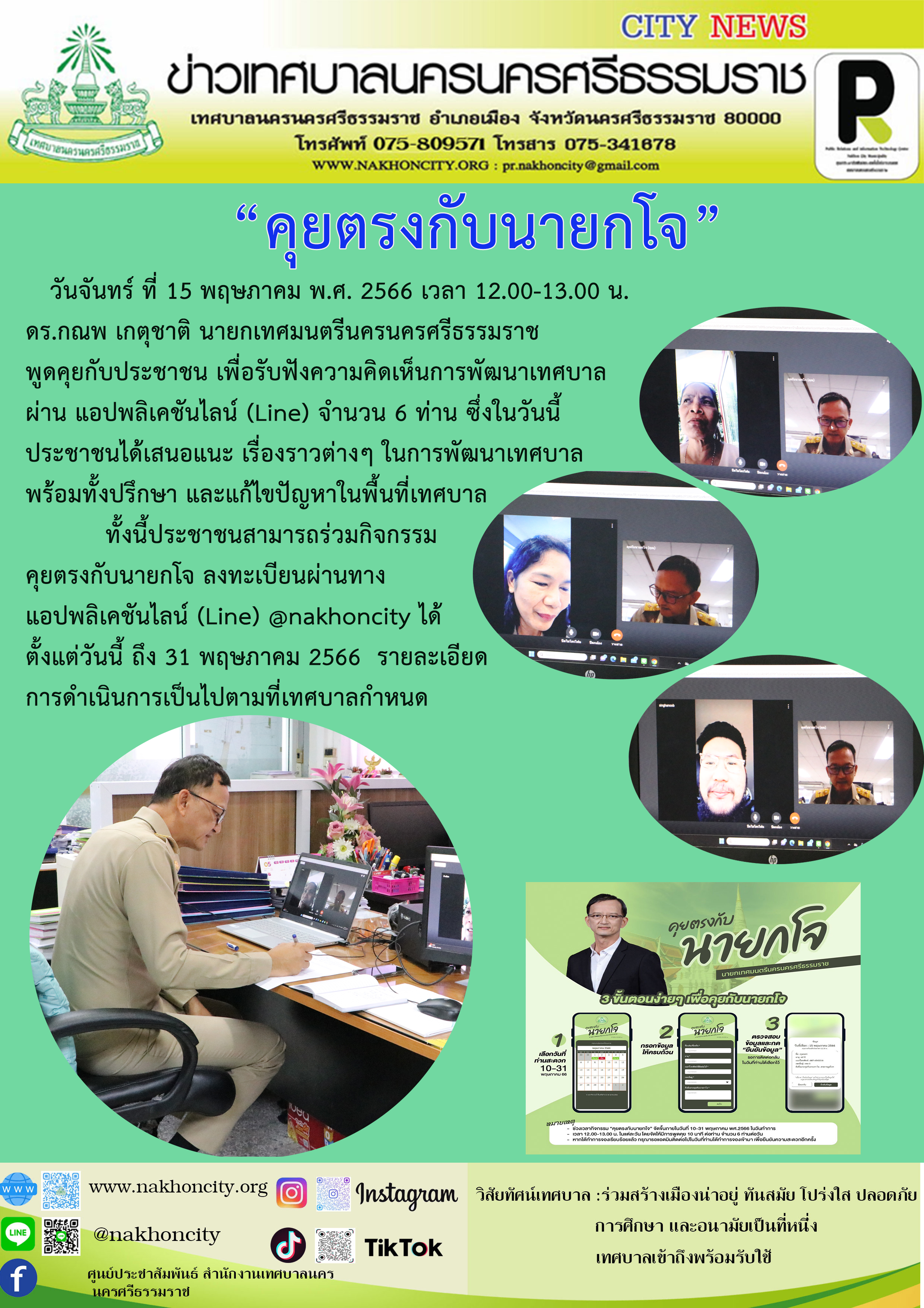 วันจันทร์ ที่ 15 พฤษภาคม พ.ศ. 2566 เวลา 12.00-13.00 น. ดร.กณพ เกตุชาติ นายกเทศมนตรีนครนครศรีธรรมราช พูดคุยกับประชาชน เพื่อรับฟังความคิดเห็นการพัฒนาเทศบาล ผ่าน แอปพลิเคชันไลน์ (Line) จำนวน 6 ท่าน ซึ่งในวันนี้ ประชาชนได้เสนอแนะ เรื่องราวต่างๆ ในการพัฒนาเทศบาล พร้อมทั้งปรึกษา และแก้ไขปัญหาในพื้นที่เทศบาล