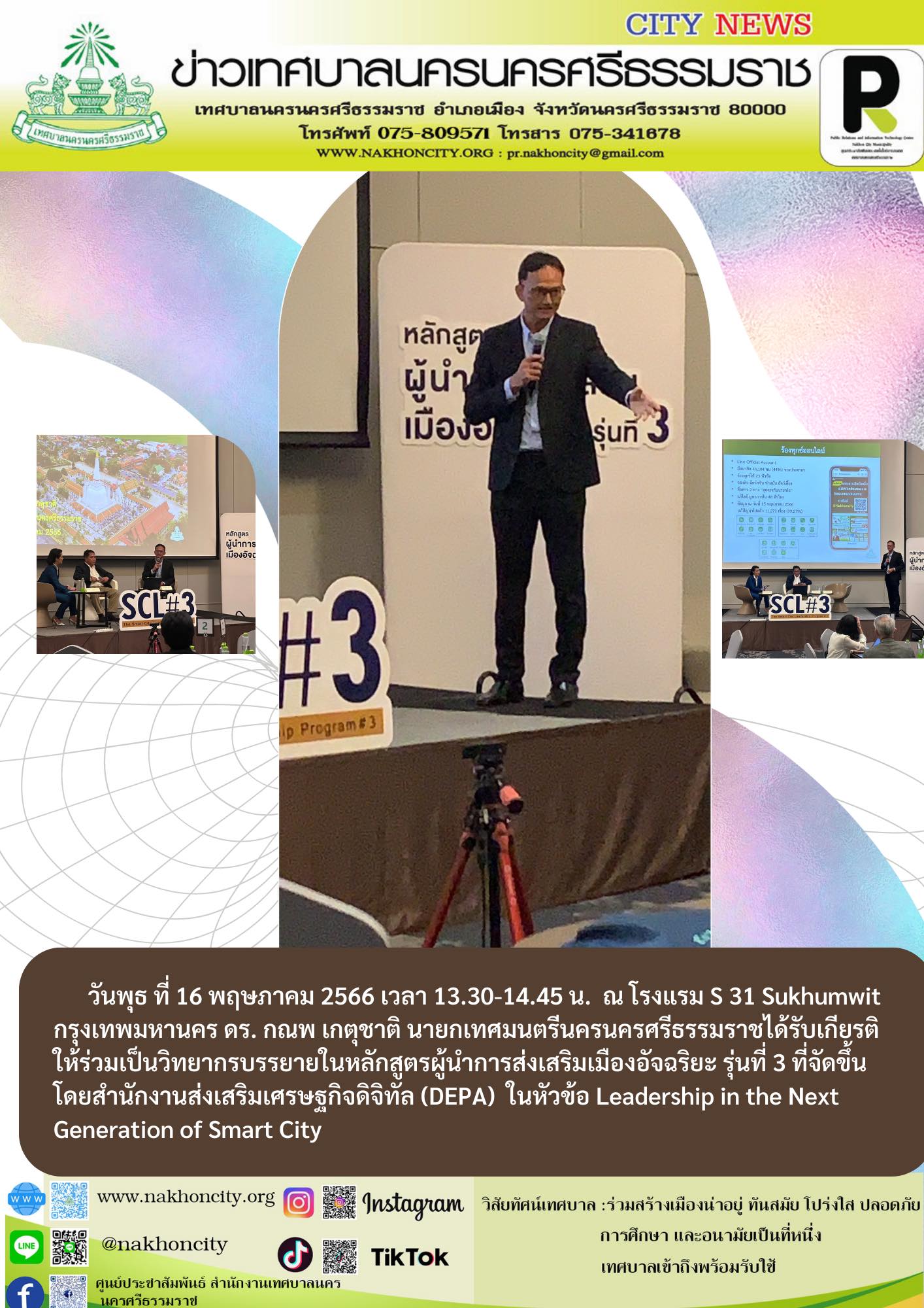 วันพุธ ที่ 16 พฤษภาคม 2566 เวลา 13.30-14.45 น. ณ โรงแรม S 31 Sukhumwit กรุงเทพมหานคร ดร. กณพ เกตุชาติ นายกเทศมนตรีนครนครศรีธรรมราชได้รับเกียรติให้ร่วมเป็นวิทยากรบรรยายในหลักสูตรผู้นำการส่งเสริมเมืองอัจฉริยะ รุ่นที่ 3 ที่จัดขึ้นโดยสำนักงานส่งเสริมเศรษฐกิจดิจิทัล (DEPA) ในหัวข้อ Leadership in the Next Generation of Smart City |