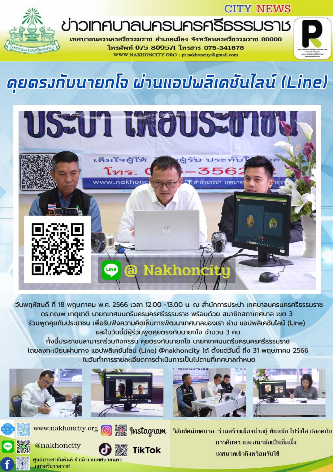 ดร.กณพ เกตุชาติ นายกเทศมนตรีนครนครศรีธรรมราช ร่วมพูดคุยกับประชาชน เพื่อรับฟังความคิดเห็นการพัฒนาเทศบาลของเรา ผ่าน แอปพลิเคชันไลน์ (Line) |