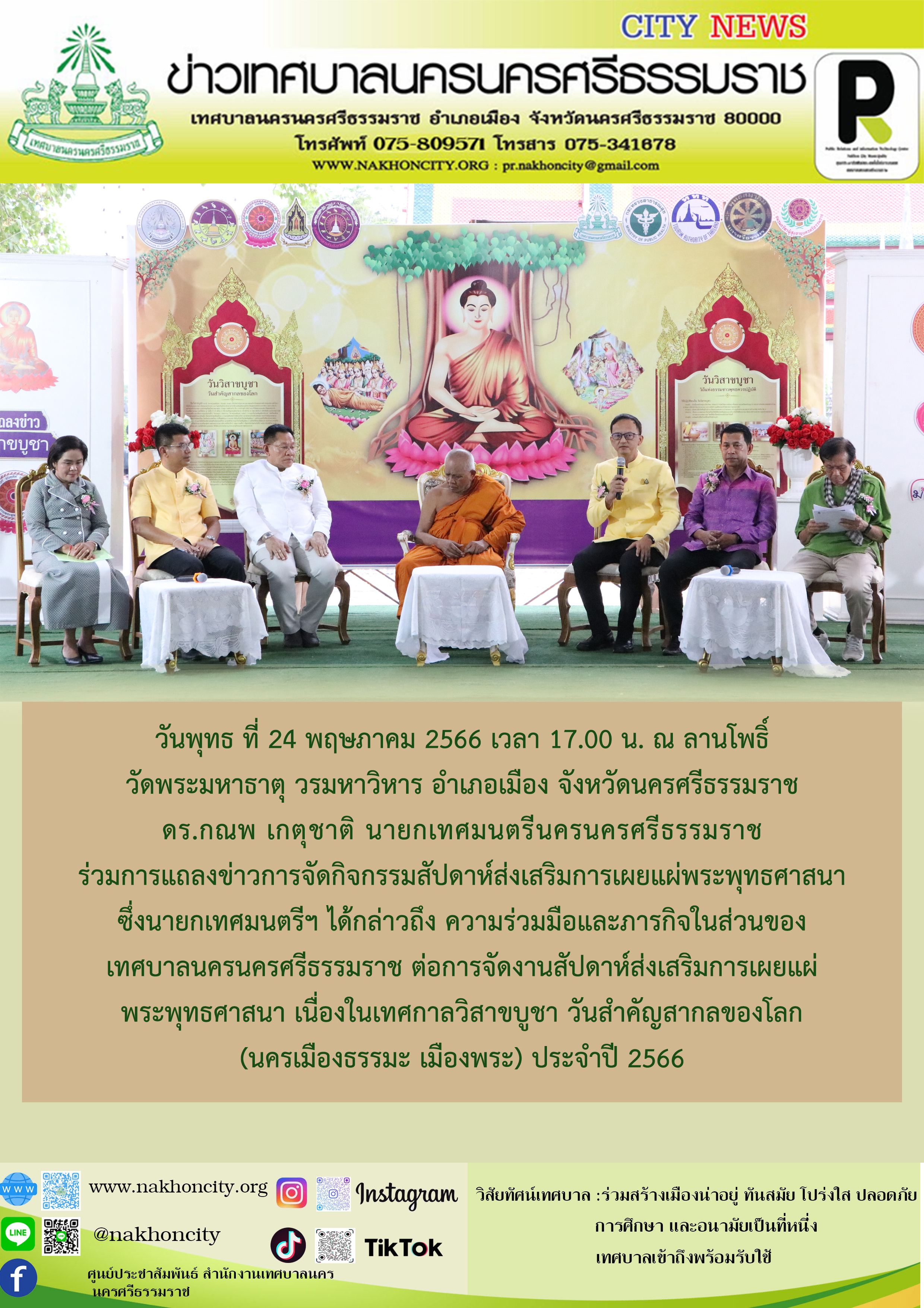 ดร.กณพ เกตุชาติ นายกเทศมนตรีนครนครศรีธรรมราช ร่วมการแถลงข่าวการจัดกิจกรรมสัปดาห์ส่งเสริมการเผยแผ่พระพุทธศาสนา เนื่องในเทศกาลวิสาขบูชา วันสำคัญสากลของโลก (นครเมืองธรรมะ เมืองพระ) ประจำปี 2566 |