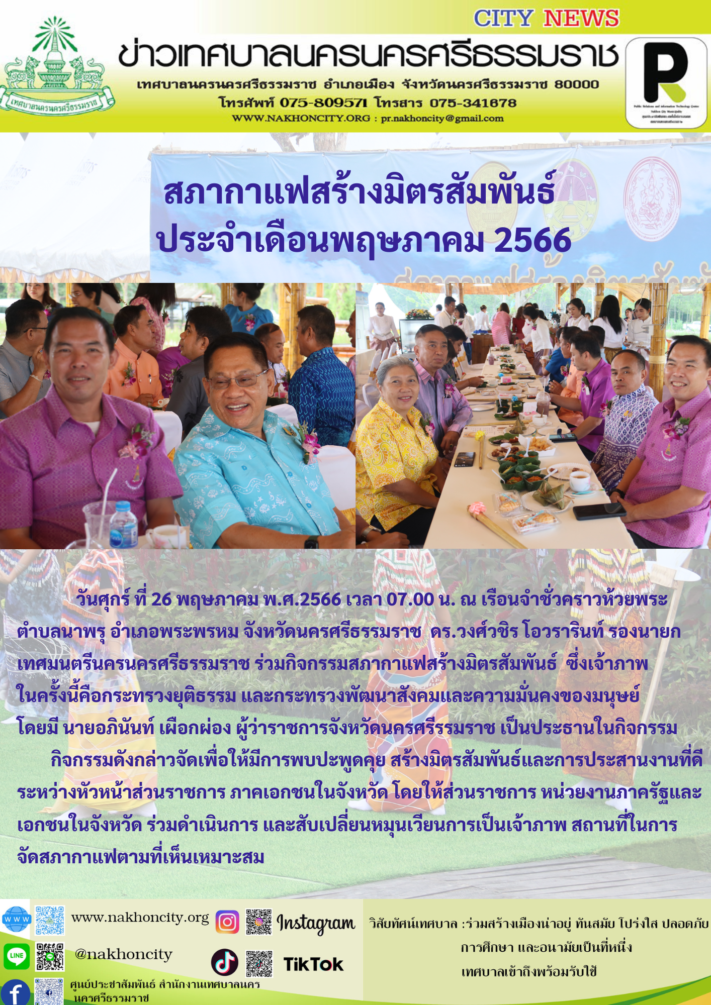 วันศุกร์ ที่ 26 พฤษภาคม พ.ศ.2566 เวลา 07.00 น. ดร.วงศ์วชิร โอวรารินท์ รองนายกเทศมนตรีนครนครศรีธรรมราช ร่วมกิจกรรมสภากาแฟสร้างมิตรสัมพันธ์ ณ เรือนจำชั่วคราวห้วยพระ ตำบลนาพรุ อำเภอพระพรหม จังหวัดนครศรีธรรมราช ซึ่งเจ้าภาพในครั้งนี้คือกระทรวงยุติธรรม และกระทรวงพัฒนาสังคมและความมั่นคงของมนุษย์ โดยมี นายอภินันท์ เผือกผ่อง ผู้ว่าราชการจังหวัดนครศรีรรมราช เป็นประธานในกิจกรรม กิจกรรมดังกล่าวจัดเพื่อให้มีการพบปะพูดคุย สร้างมิตรสัมพันธ์และการประสานงานที่ดี ระหว่างหัวหน้าส่วนราชการ ภาคเอกชนในจังหวัด โดยให้ส่วนราชการ หน่วยงานภาครัฐและเอกชนในจังหวัด ร่วมดำเนินการ และสับเปลี่ยนหมุนเวียนการเป็นเจ้าภาพ สถานที่ในการจัดสภากาแฟตามที่เห็นเหมาะสม