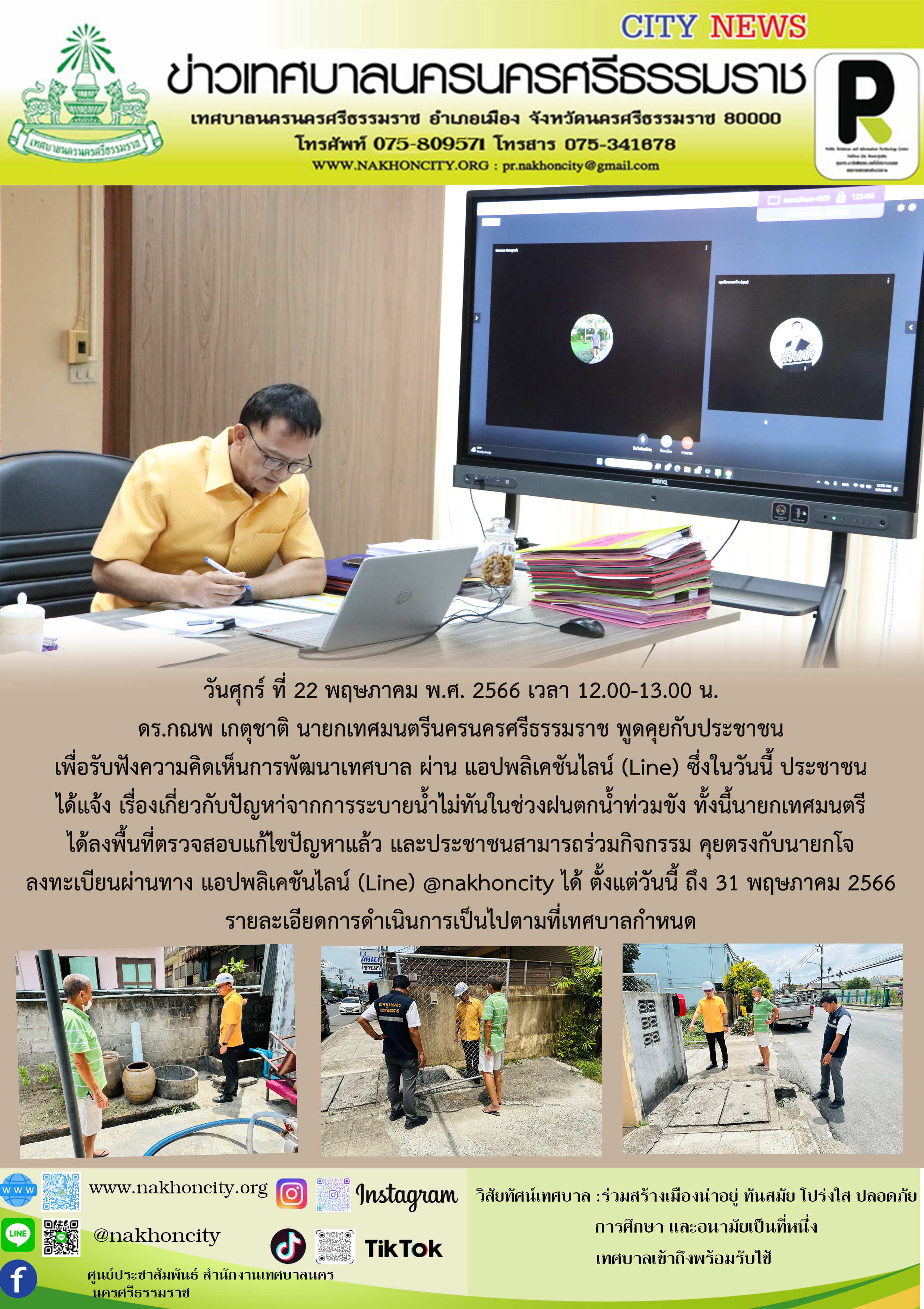 วันศุกร์ ที่ 22 พฤษภาคม พ.ศ. 2566 เวลา 12.00-13.00 น. ดร.กณพ เกตุชาติ นายกเทศมนตรีนครนครศรีธรรมราช พูดคุยกับประชาชน เพื่อรับฟังความคิดเห็นการพัฒนาเทศบาล ผ่าน แอปพลิเคชันไลน์ (Line) ซึ่งในวันนี้ ประชาชน ได้แจ้ง เรื่องเกี่ยวกับปัญหา่จากการระบายน้ำไม่ทันในช่วงฝนตกน้ำท่วมขัง ทั้งนี้นายกเทศมนตรี ได้ลงพื้นที่ตรวจสอบแก้ไขปัญหาแล้ว และประชาชนสามารถร่วมกิจกรรม คุยตรงกับนายกโจ ลงทะเบียนผ่านทาง แอปพลิเคชันไลน์ (Line) @nakhoncity ได้ ตั้งแต่วันนี้ ถึง 31 พฤษภาคม 2566 รายละเอียดการดำเนินการเป็นไปตามที่เทศบาลกำหนด ภาพ/ข่าว//ไกรสิทธิ ตรวจทาน//ฐิตินันท์ |