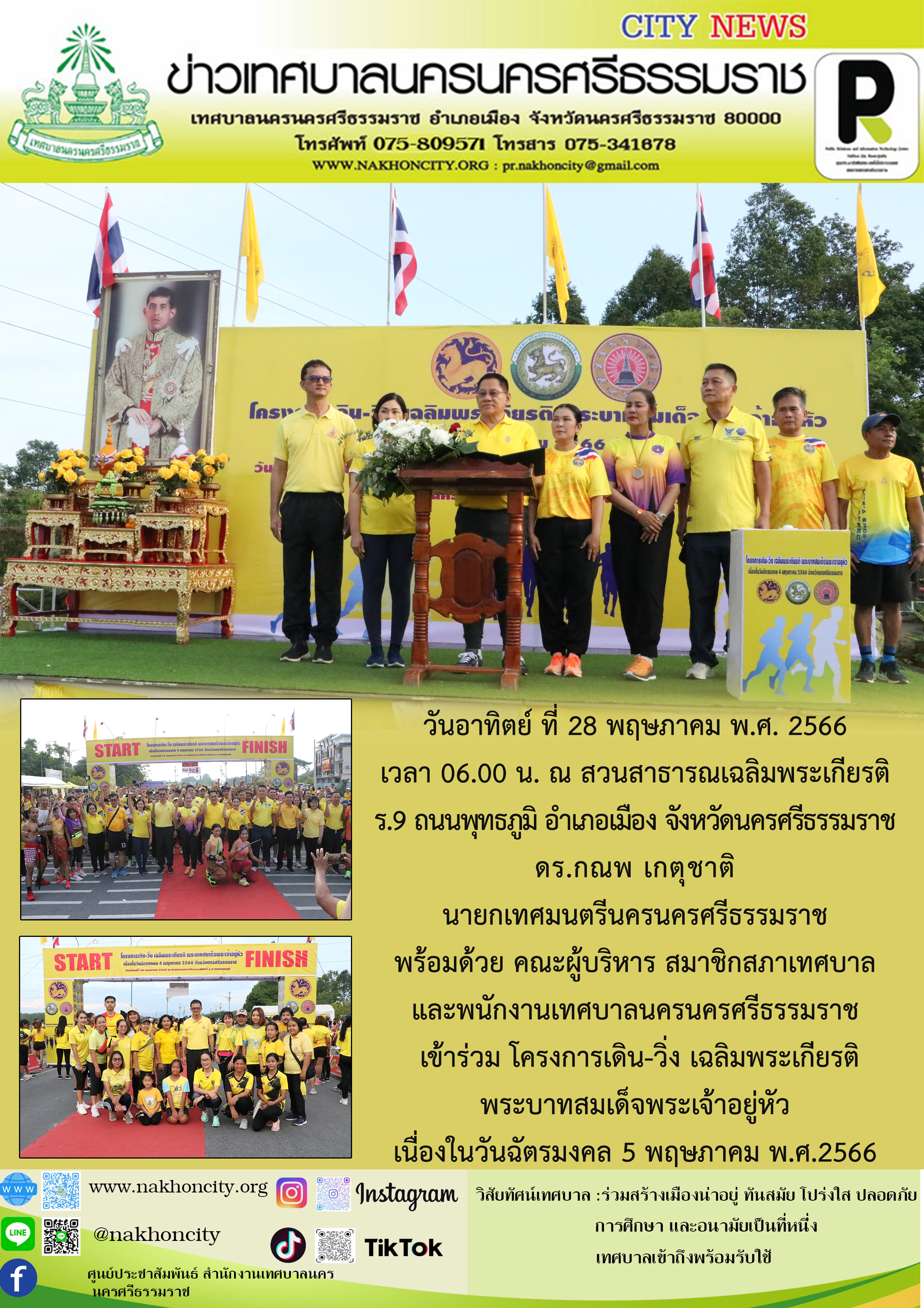 วันอาทิตย์ ที่ 28 พฤษภาคม พ.ศ. 2566 เวลา 06.00 น. ณ สวนสาธารณเฉลิมพระเกียรติ ร.9 ถนนพุทธภูมิ อำเภอเมือง จังหวัดนครศรีธรรมราช