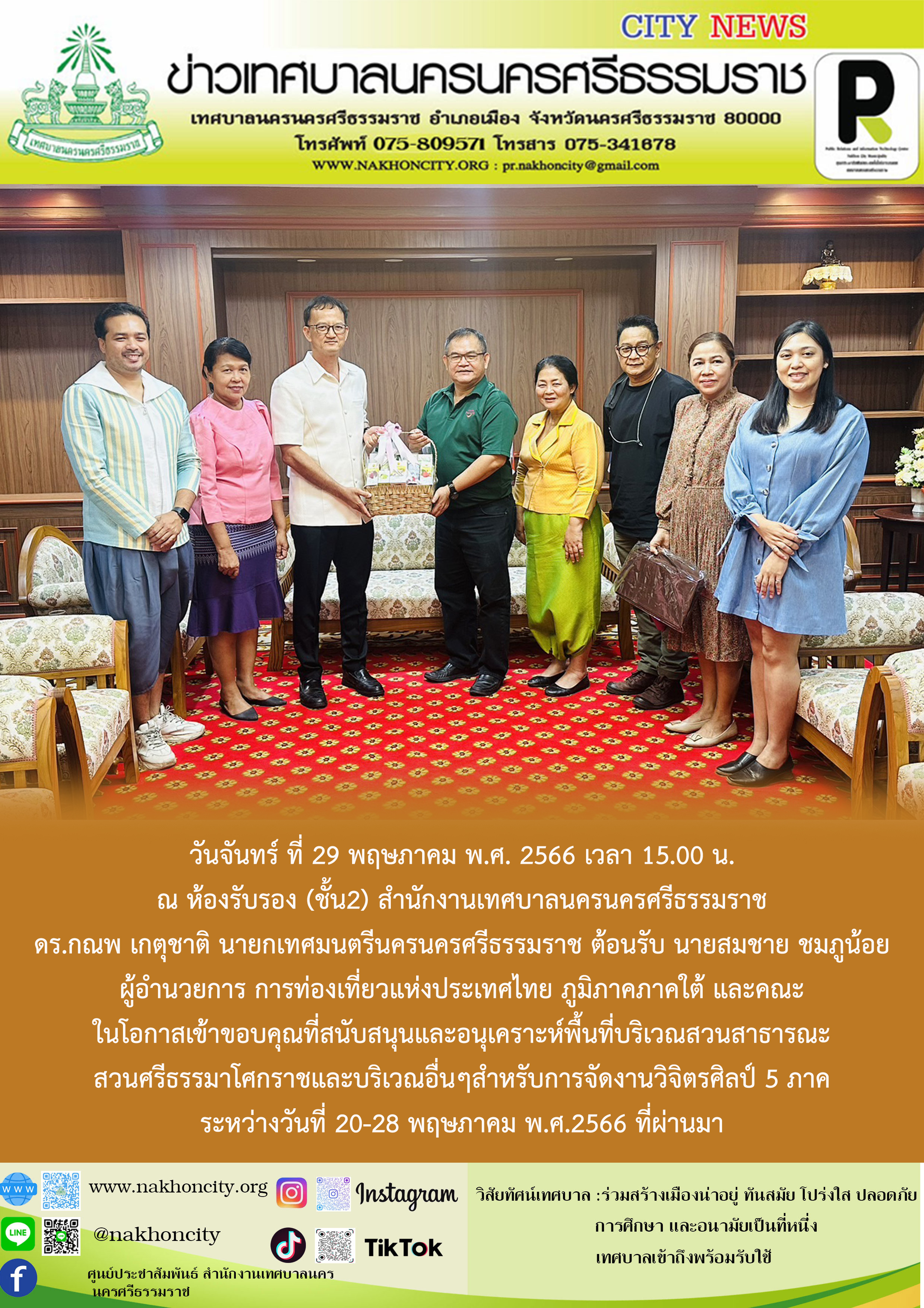 ดร.กณพ เกตุชาติ นายกเทศมนตรีนครนครศรีธรรมราช ต้อนรับ นายสมชาย ชมภูน้อย ผู้อำนวยการ การท่องเที่ยวแห่งประเทศไทย ภูมิภาคภาคใต้ และคณะ |