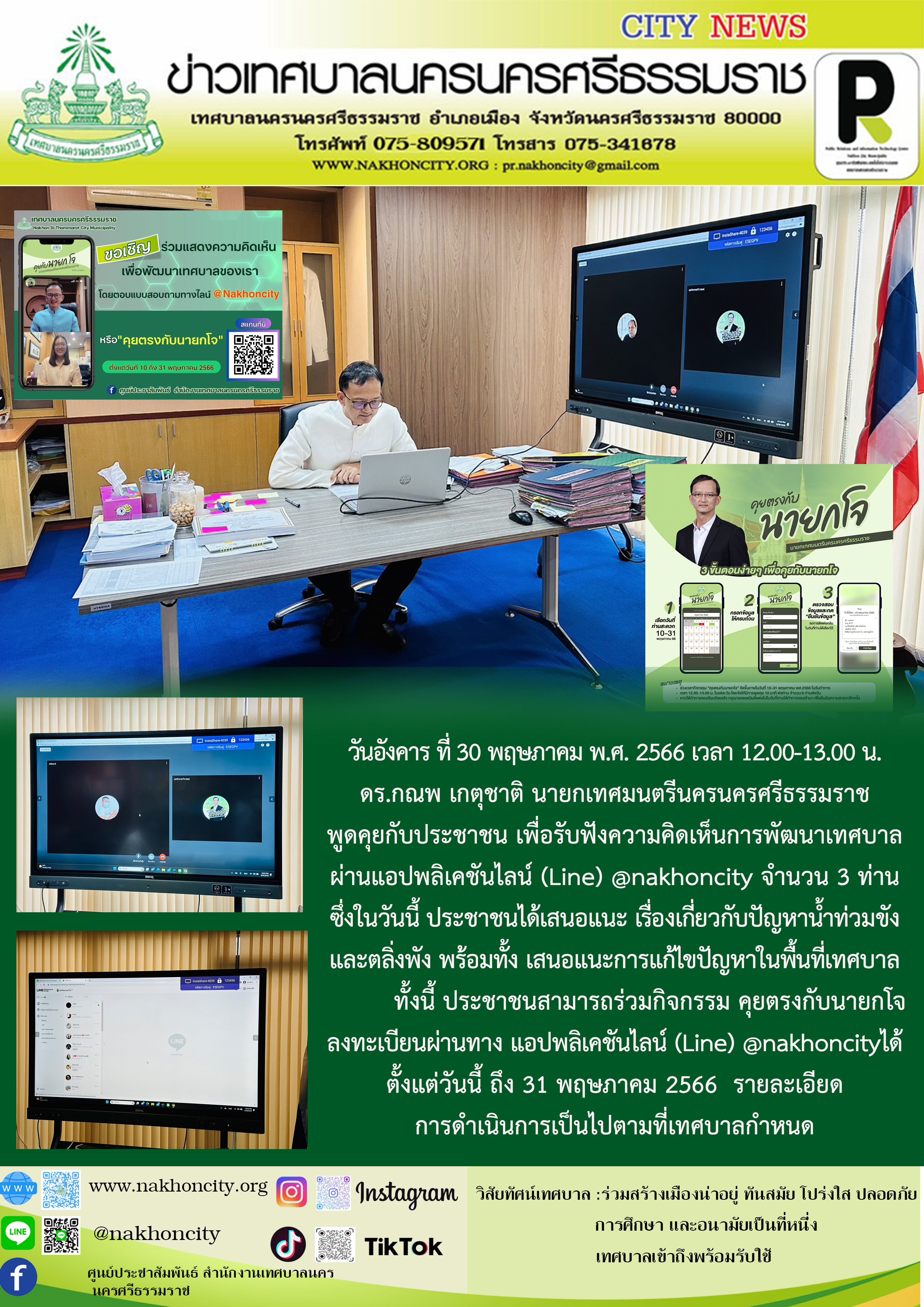 วันอังคาร ที่ 30 พฤษภาคม พ.ศ. 2566 เวลา 12.00-13.00 น. ดร.กณพ เกตุชาติ นายกเทศมนตรีนครนครศรีธรรมราช พูดคุยกับประชาชน เพื่อรับฟังความคิดเห็นการพัฒนาเทศบาล ผ่าน แอปพลิเคชันไลน์ (Line) @nakhoncity จำนวน 3 ท่าน ซึ่งในวันนี้ ประชาชนได้เสนอแนะ เรื่องเกี่ยวกับปัญหาน้ำท่วมขัง และตลิ่งพังพร้อมทั้งเสนอแนะการแก้ไขปัญหาในพื้นที่เทศบาล