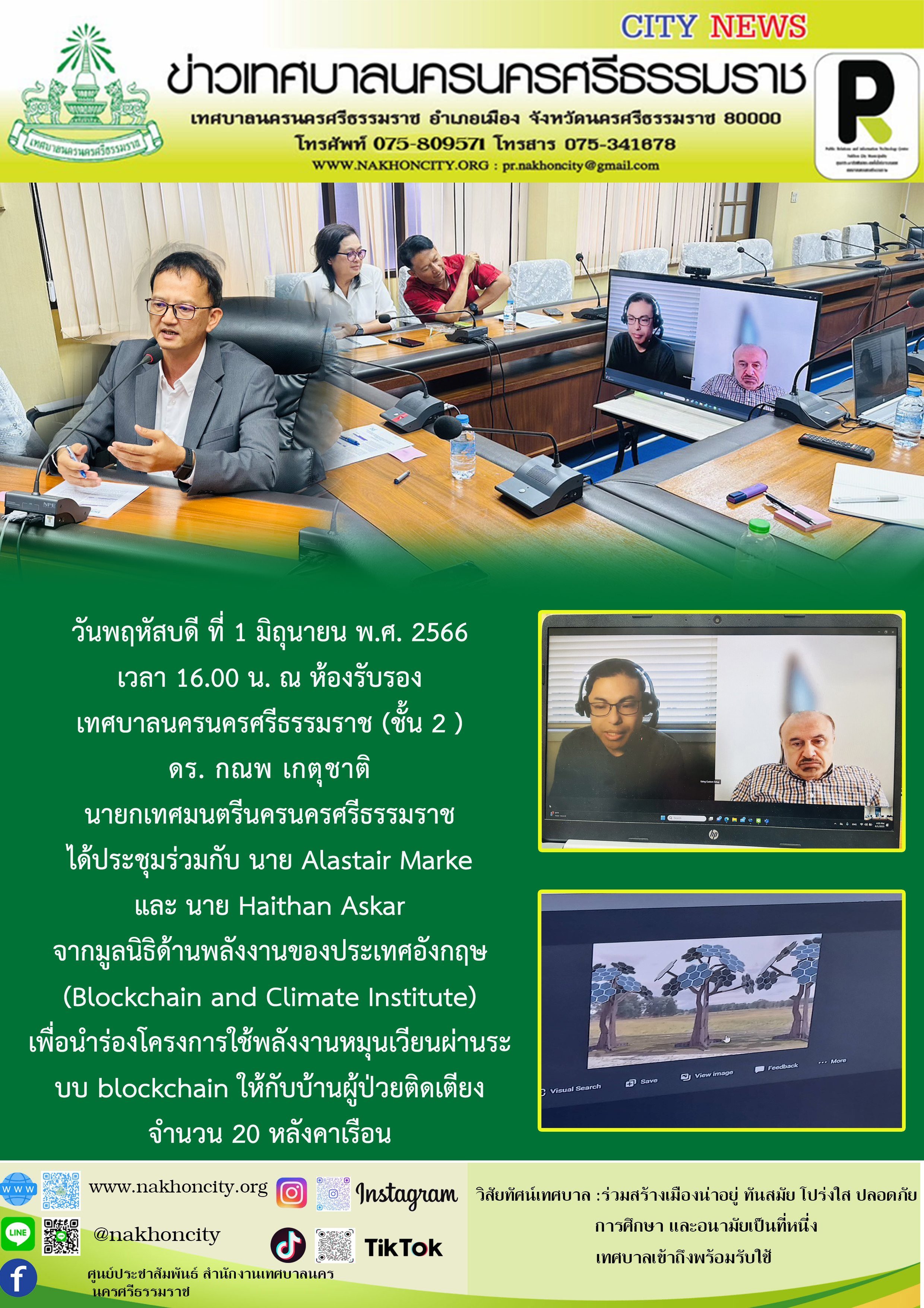 วันพฤหัสบดี ที่ 1 มิถุนายน พ.ศ. 2566 เวลา 16.00 น. ณ ห้องรับรอง เทศบาลนครนครศรีธรรมราช (ชั้น 2 ) ดร. กณพ เกตุชาติ นายกเทศมนตรีนครนครศรีธรรมราช ได้ประชุมร่วมกับ นาย Alastair Marke และ นาย Haithan Askar จากมูลนิธิด้านพลังงานของประเทศอังกฤษ (Blockchain and Climate Institute) เพื่อนำร่องโครงการใช้พลังงานหมุนเวียนผ่านระบบ blockchain ให้กับบ้านผู้ป่วยติดเตียง จำนวน 20 หลังคาเรือน |
