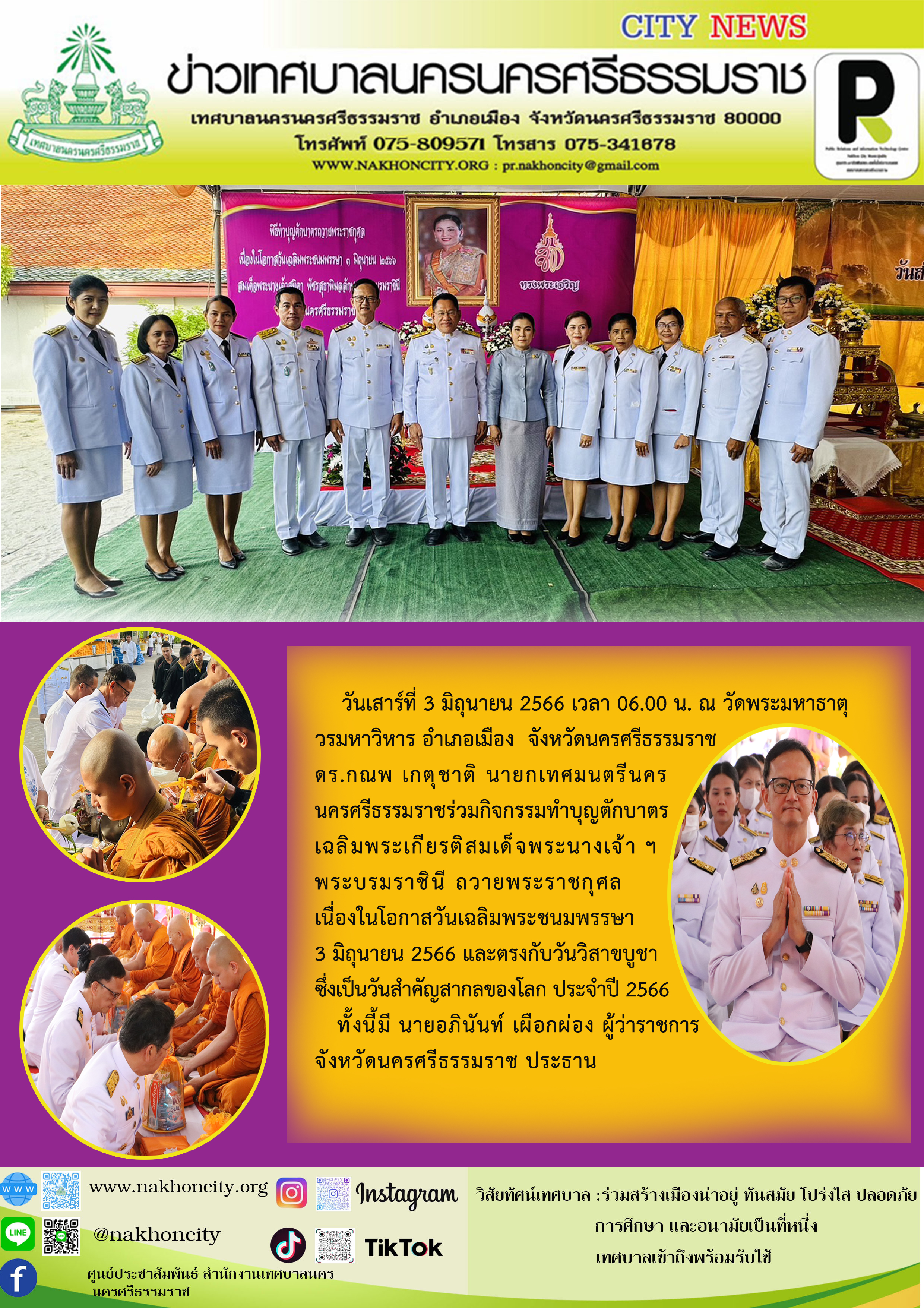 ดร.กณพ เกตุชาติ นายกเทศมนตรีนครนครศรีธรรมราช ร่วมกิจกรรมทำบุญตักบาตรเฉลิมพระเกียรติสมเด็จพระนางเจ้า ฯ พระบรมราชินี ถวายพระราชกุศล เนื่องในโอกาสวันเฉลิมพระชนมพรรษา 3 มิถุนายน 2566 และตรงกับวันวิสาขบูชา |