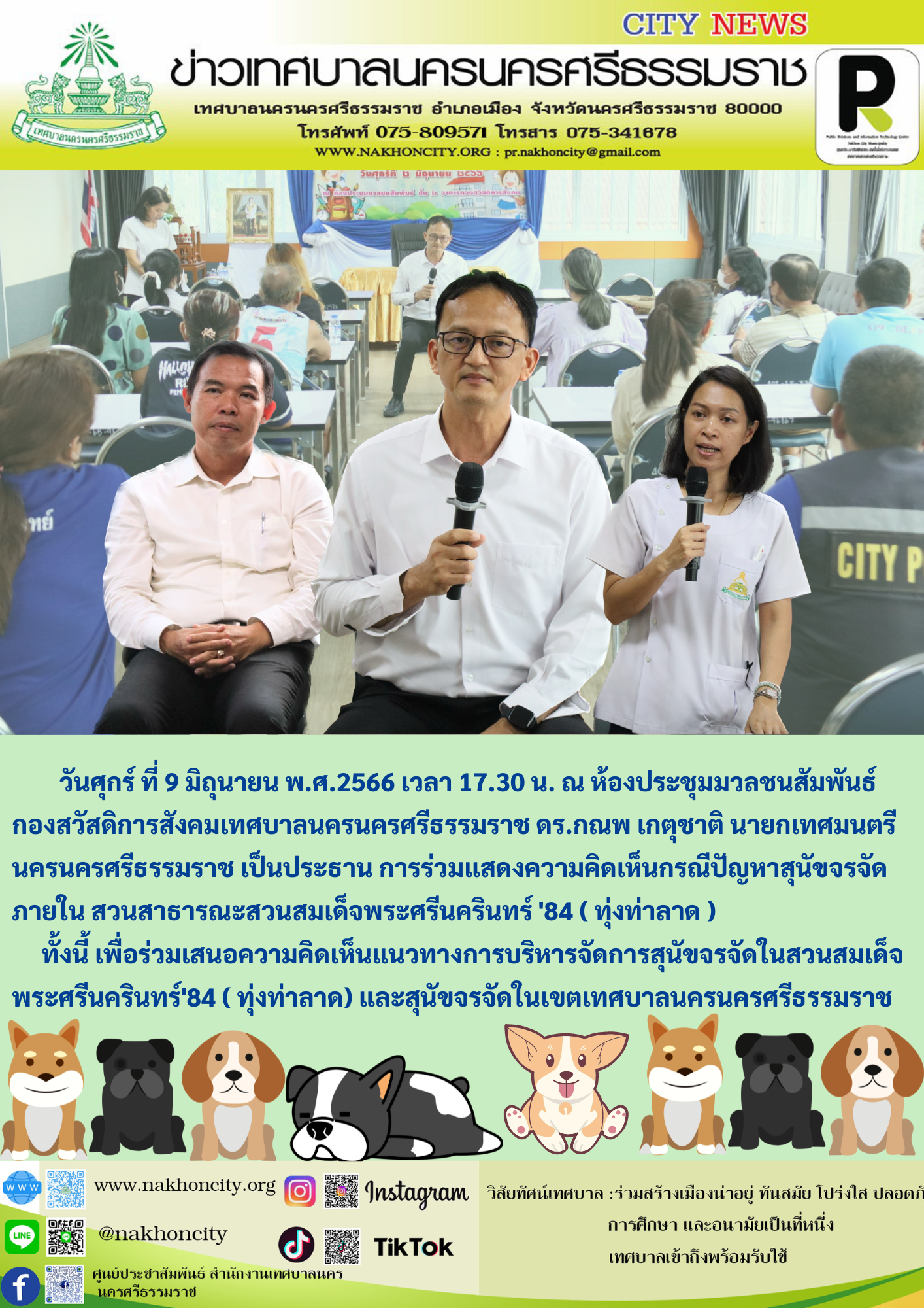 วันศุกร์ ที่ 9 มิถุนายน พ.ศ.2566 เวลา 17.30 น. ณ ห้องประชุมมวลชนสัมพันธ์ กองสวัสดิการสังคมเทศบาลนครนครศรีธรรมราช ดร.กณพ เกตุชาติ นายกเทศมนตรีนครนครศรีธรรมราช เป็นประธาน การร่วมแสดงความคิดเห็นกรณีปัญหาสุนัขจรจัดใน สวนสาธารณะสวนสมเด็จพระศรีนครินทร์ '84 ( ทุ่งท่าลาด ) ทั้งนี้ เพื่อร่วมเสนอความคิดเห็นแนวทางการบริหารจัดการสุนัขจรจัดในสวนสมเด็จพระศรีนครินทร์'84 ( ทุ่งท่าลาด) และสุนัขจรจัดในเขตเทศบาลนครนครศรีธรรมราช |