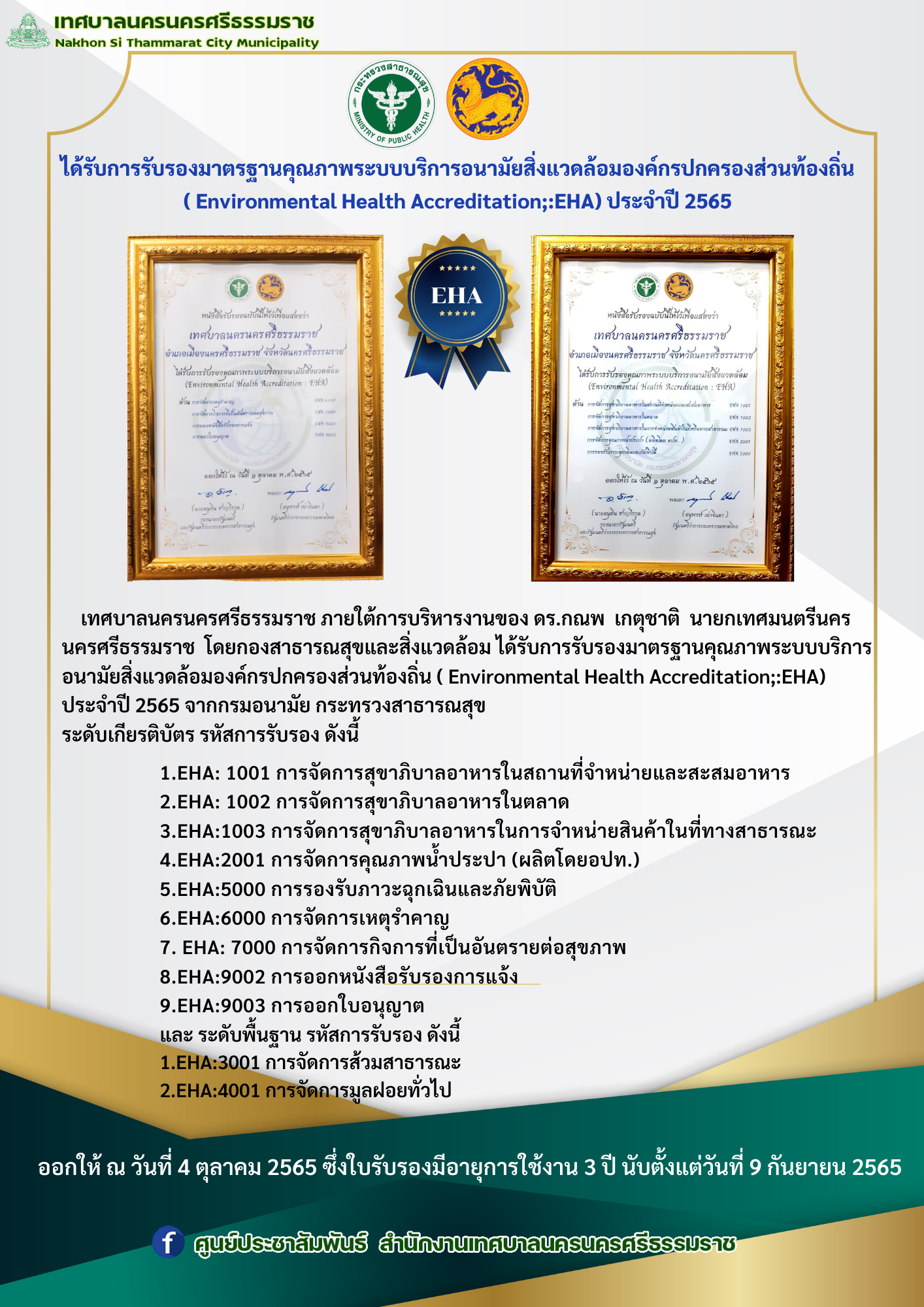 เทศบาลนครนครศรีธรรมราช ภายใต้การบริหารงานของ ดร.กณพ เกตุชาติ นายกเทศมนตรีนครนครศรีธรรมราช โดยกองสาธารณสุขและสิ่งแวดล้อม ได้รับการรับรองมาตรฐานคุณภาพระบบบริการอนามัยสิ่งแวดล้อมองค์กรปกครองส่วนท้องถิ่น ( Environmental Health Accreditation;:EHA) ประจำปี 2565 จากกรมอนามัย กระทรวงสาธารณสุข ระดับเกียรติบัตร รหัสการรับรอง ดังนี้ 1.EHA: 1001 การจัดการสุขาภิบาลอาหารในสถานที่จำหน่ายและสะสมอาหาร 2.EHA: 1002 การจัดการสุขาภิบาลอาหารในตลาด 3.EHA:1003 การจัดการสุขาภิบาลอาหารในการจำหน่ายสินค้าในที่ทางสาธารณะ 4.EHA:2001 การจัดการคุณภาพน้ำประปา (ผลิตโดยอปท.) 5.EHA:5000 การรองรับภาวะฉุกเฉินและภัยพิบัติ 6.EHA:6000 การจัดการเหตุรำคาญ 7. EHA: 7000 การจัดการกิจการที่เป็นอันตรายต่อสุขภาพ 8.EHA:9002 การออกหนังสือรับรองการแจ้ง 9.EHA:9003 การออกใบอนุญาต และ ระดับพื้นฐาน รหัสการรับรอง ดังนี้ 1.EHA:3001 การจัดการส้วมสาธารณะ 2.EHA:4001 การจัดการมูลฝอยทั่วไป ออกให้ ณ วันที่ 4 ตุลาคม 2565 ซึ่งใบรับรองมีอายุการใช้งาน 3 ปี นับตั้งแต่วันที่ 9 กันยายน 2565