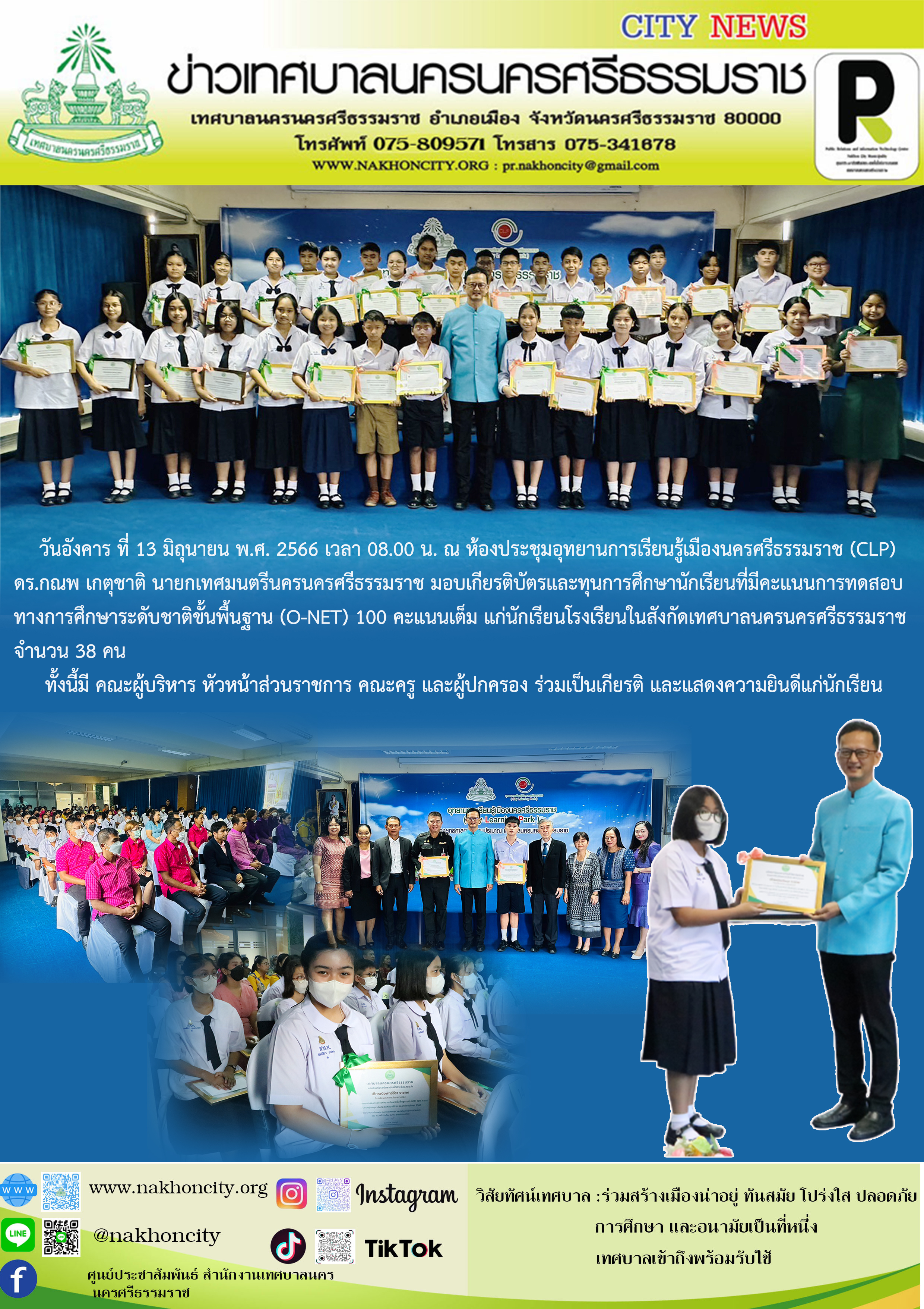 ดร.กณพ เกตุชาติ นายกเทศมนตรีนครนครศรีธรรมราช มอบเกียรติบัตรและทุนการศึกษา นักเรียนที่มีคะแนนการทดสอบทางการศึกษาระดับชาติขั้นพื้นฐาน (O-NET) 100 คะแนนเต็ม แก่นักเรียนโรงเรียนในสังกัดเทศบาลนครนครศรีธรรมราช |