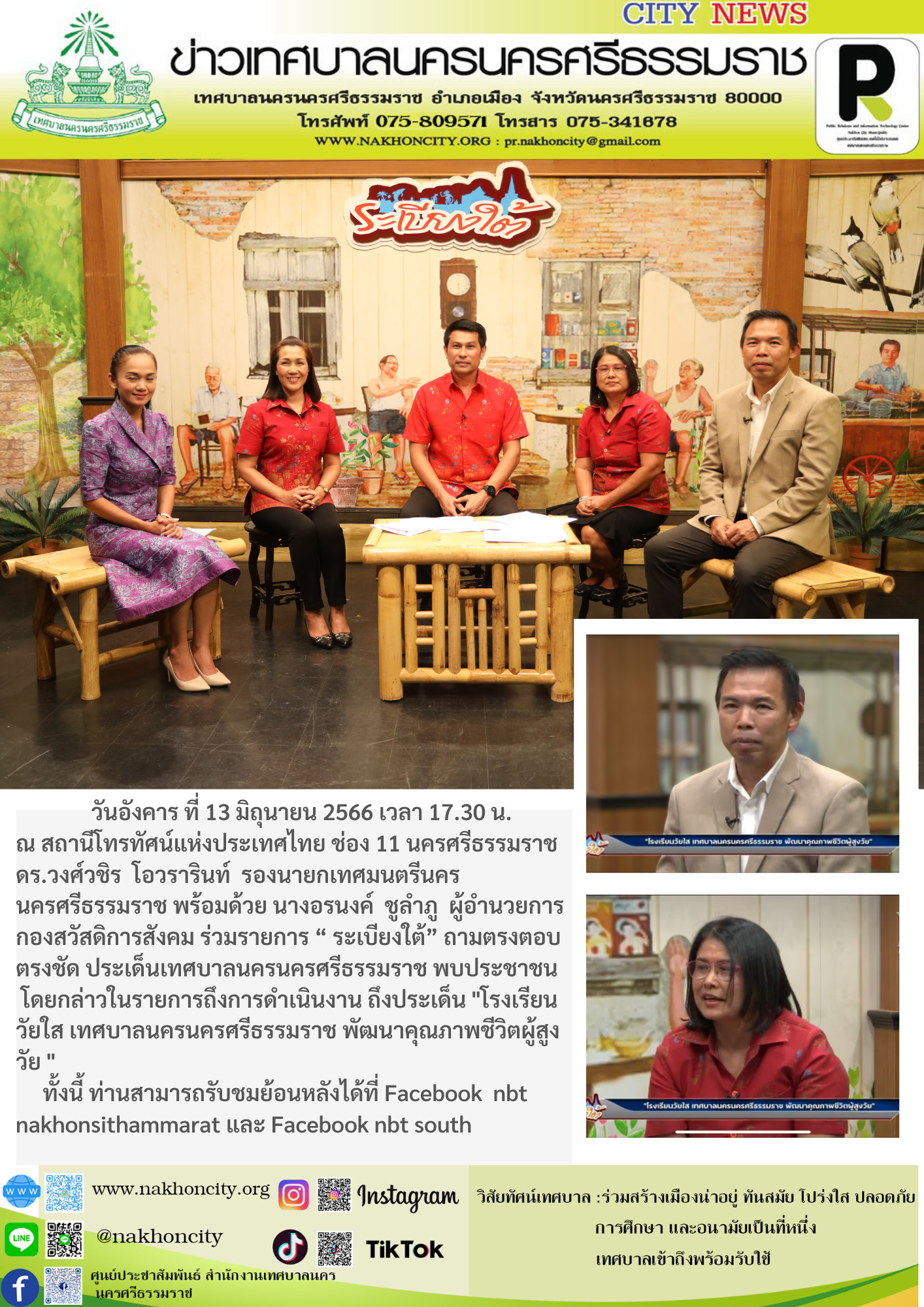 วันอังคาร ที่ 13 มิถุนายน 2566 เวลา 17.30 น. ณ สถานีโทรทัศน์แห่งประเทศไทย ช่อง 11 นครศรีธรรมราช ดร.วงศ์วชิร โอวรารินท์ รองนายกเทศมนตรีนครนครศรีธรรมราช พร้อมด้วย นางอรนงค์ ชูลำภู ผู้อำนวยการกองสวัสดิการสังคม ร่วมรายการ “ ระเบียงใต้” ถามตรงตอบตรงชัด ประเด็นเทศบาลนครนครศรีธรรมราช พบประชาชนโดยกล่าวในรายการถึงการดำเนินงาน ถึงประเด็น "โรงเรียนวัยใส เทศบาลนครนครศรีธรรมราช พัฒนาคุณภาพชีวิตผู้สูงวัย " ทั้งนี้ ท่านสามารถรับชมย้อนหลังได้ที่ Facebook nbt nakhonsithammarat และ Facebook nbt south |