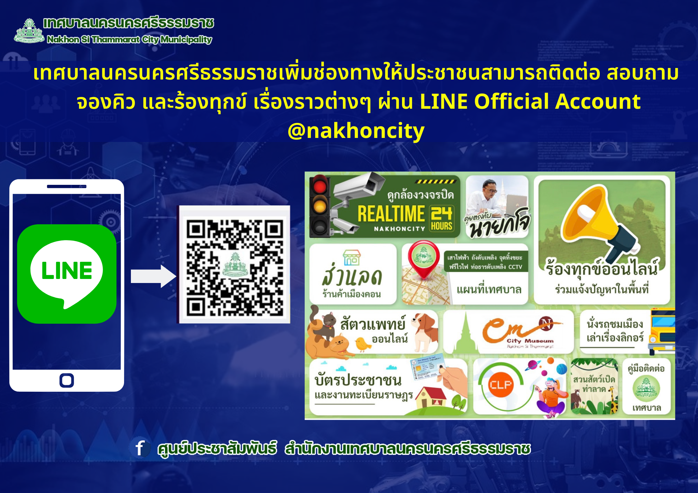 เทศบาลนครนครศระรรมราช ภายใต้การบริหารของ ดร.กณพ เกตุชาติ นายกเทศมนตรีนครนครศรีธรรมราช โดยกองยุทธศาสตร์และงบประมาณ เพิ่มช่องทางให้ประชาชนสามารถติดต่อ สอบถาม จองคิว และร้องทุกข์ เรื่องราวต่างๆ ผ่าน LINE Official Account @nakhoncity ดังนี้