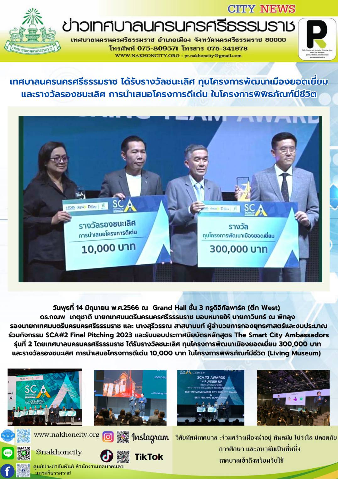 เทศบาลนครนครศรีธรรมราช ได้รับรางวัลชนะเลิศ ทุนโครงการพัฒนาเมืองยอดเยี่ยม และรางวัลรองชนะเลิศ การนำเสนอโครงการดีเด่น ในโครงการพิพิธภัณฑ์มีชีวิต (Living Museum) BEST INITIATIVE SMART CITY PROJECT AWARD & BEST PITCHING TEAM AWARD |