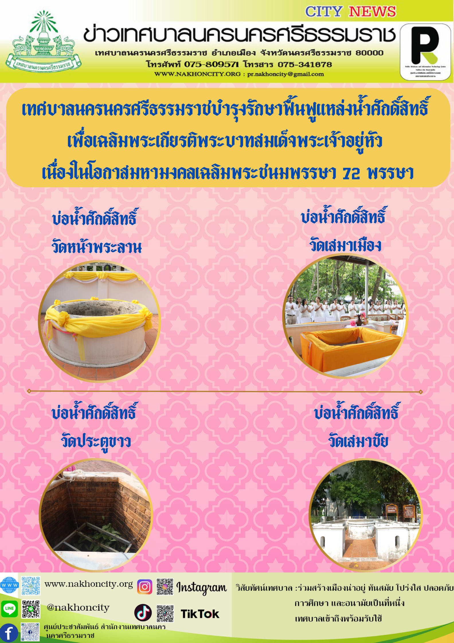 เทศบาลนครนครศรีธรรมราชบำรุงรักษาฟื้นฟูแหล่งน้ำศักดิ์สิทธิ์ เพื่อเฉลิมพระเกียรติพระบาทสมเด็จพระเจ้าอยู่หัว เนื่องในโอกาสมหามงคลเฉลิมพระชนมพรรษา 72 พรรษา |