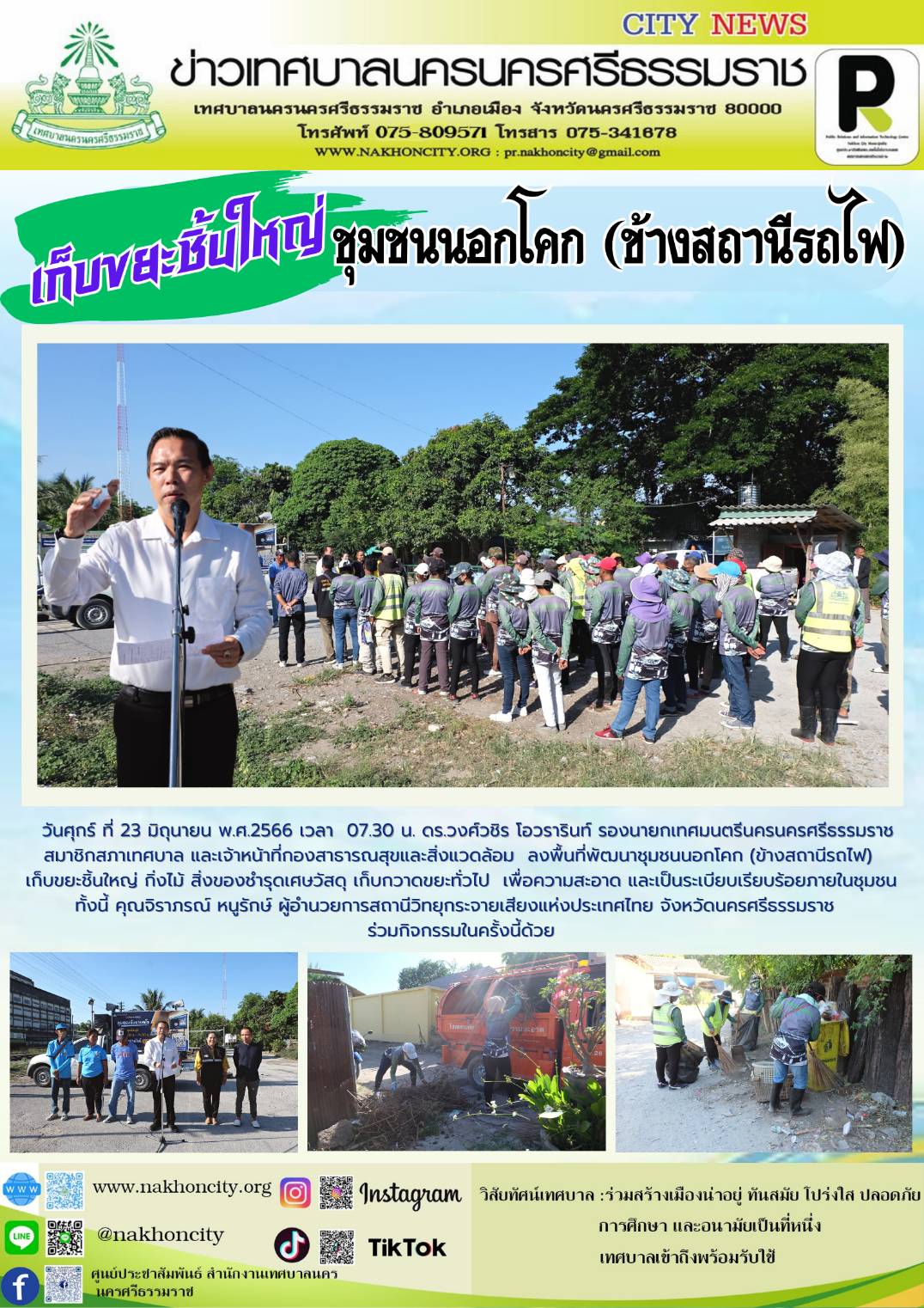 วันศุกร์ ที่ 23 มิถุนายน พ.ศ.2566 เวลา 07.30 น. ดร.วงศ์วชิร โอวรารินท์ รองนายกเทศมนตรีนครนครศรีธรรมราช สมาชิกสภาเทศบาล และเจ้าหน้าที่กองสาธารณสุขและสิ่งแวดล้อม ลงพื้นที่พัฒนาชุมชนนอกโคก (ข้างสถานีรถไฟ) เก็บขยะชิ้นใหญ่ กิ่งไม้ สิ่งของชำรุดเศษวัสดุ เก็บกวาดขยะทั่วไป เพื่อความสะอาด และเป็นระเบียบเรียบร้อยภายในชุมชน |